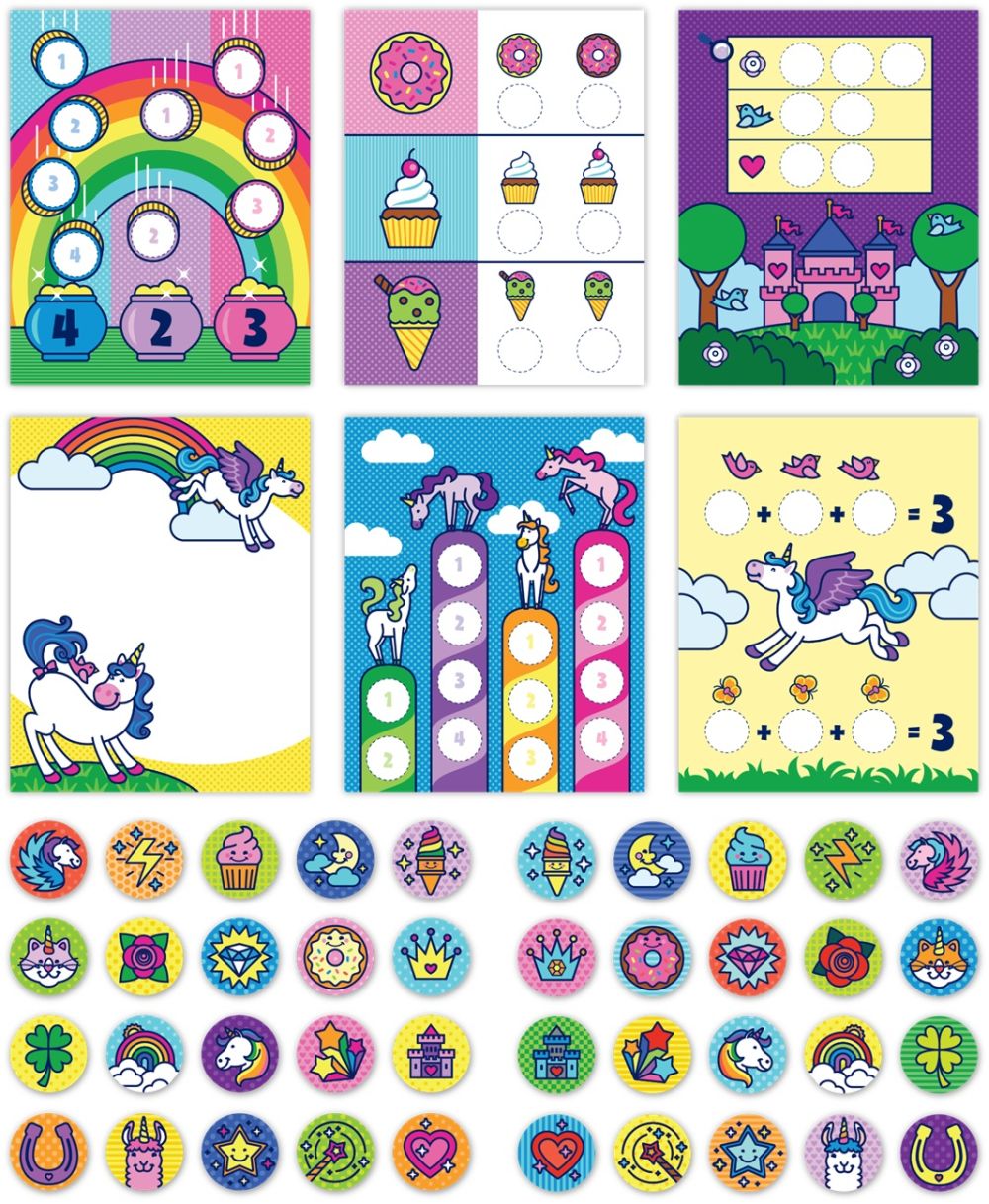 Kouzelné tuby plné samolepek, které sa dají snadno odstraňovat. V archu s obrázky jsou prázdná místa pro samolepky, kam je děti ze zásobníku snadno nalepí. Je to snadné a velmi zábavné. Položka obsahuje téma Jednorožci.