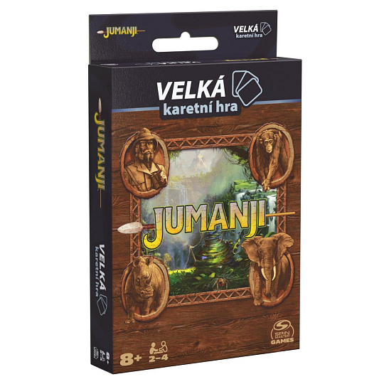 Nezačínejte hrát, pokud nechcete hru dohrát! S karetní hrou Jumanji budete moct se svými kolegy dobrodruhy vyrazit na výpravu džunglí plnou řešení hádanek a plnění výzev, zatímco se všichni budete snažit přežít! Tuto karetní hru je snadné připravit a začít hrát. Vylámejte hrací postavičky, složte je do tvaru stanu a umístěte je na pole pro sledovaní životů na jejich odpovídající barvu. Takto bude mít každý hráč přehled o svých životech. Hra je ideální pro milovníky kultovního filmu Jumanji, ať už dávají přednost tomu s Robinem Williamsem nebo Dwaynem Johnsonem. Položte referenční kartu hádanky lícem nahoru před všechny hráče a výzvu zamíchejte. Dostaňte se přes 10 výzev a ujistěte se, že všichni přežijí! Chceš-li poznat nový svět... pusť se do hry právě teď. Tuto společenskou hru lze hrát jako deskovku pro 2 až 4 hráče. Na věku nezáleží – s touto párty deskovkou se určitě při rodinném večeru pobaví dospělí, teenageři i děti ve věku 8 a více let! Klasický akční film Jumanji má tu nejlepší hru pro dospělé i pro děti. Je to skvělá hra na cesty, ale poslouží i jako žertovný dárek nebo dárek k narozeninám. Nebojte se... zahrát si karetní verzi Jumanji!