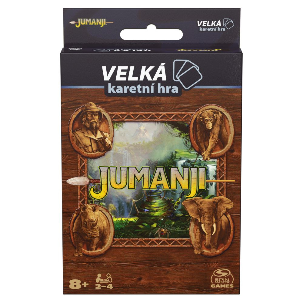Nezačínejte hrát, pokud nechcete hru dohrát! S karetní hrou Jumanji budete moct se svými kolegy dobrodruhy vyrazit na výpravu džunglí plnou řešení hádanek a plnění výzev, zatímco se všichni budete snažit přežít! Tuto karetní hru je snadné připravit a začít hrát. Vylámejte hrací postavičky, složte je do tvaru stanu a umístěte je na pole pro sledovaní životů na jejich odpovídající barvu. Takto bude mít každý hráč přehled o svých životech. Hra je ideální pro milovníky kultovního filmu Jumanji, ať už dávají přednost tomu s Robinem Williamsem nebo Dwaynem Johnsonem. Položte referenční kartu hádanky lícem nahoru před všechny hráče a výzvu zamíchejte. Dostaňte se přes 10 výzev a ujistěte se, že všichni přežijí! Chceš-li poznat nový svět... pusť se do hry právě teď. Tuto společenskou hru lze hrát jako deskovku pro 2 až 4 hráče. Na věku nezáleží – s touto párty deskovkou se určitě při rodinném večeru pobaví dospělí, teenageři i děti ve věku 8 a více let! Klasický akční film Jumanji má tu nejlepší hru pro dospělé i pro děti. Je to skvělá hra na cesty, ale poslouží i jako žertovný dárek nebo dárek k narozeninám. Nebojte se... zahrát si karetní verzi Jumanji!