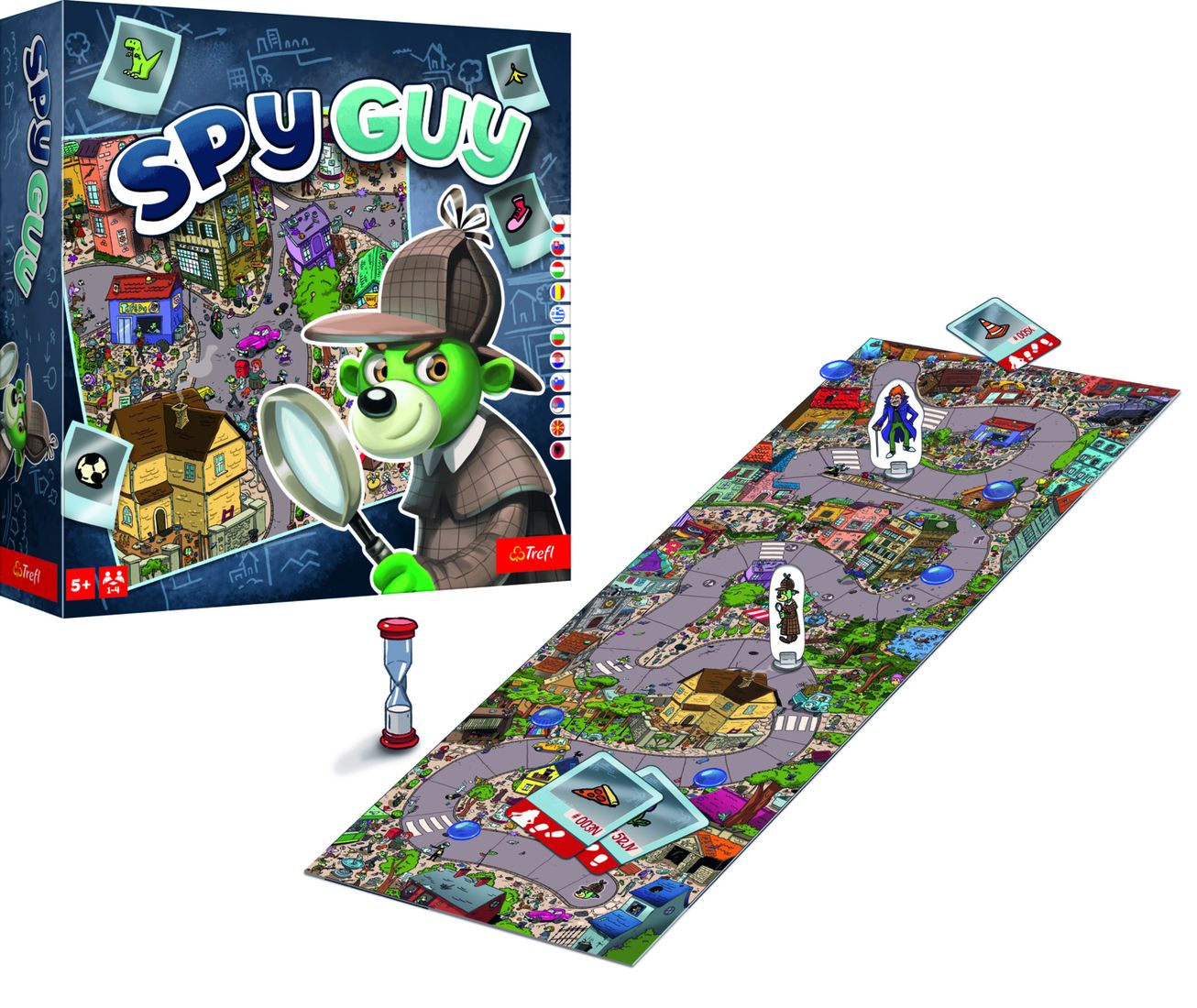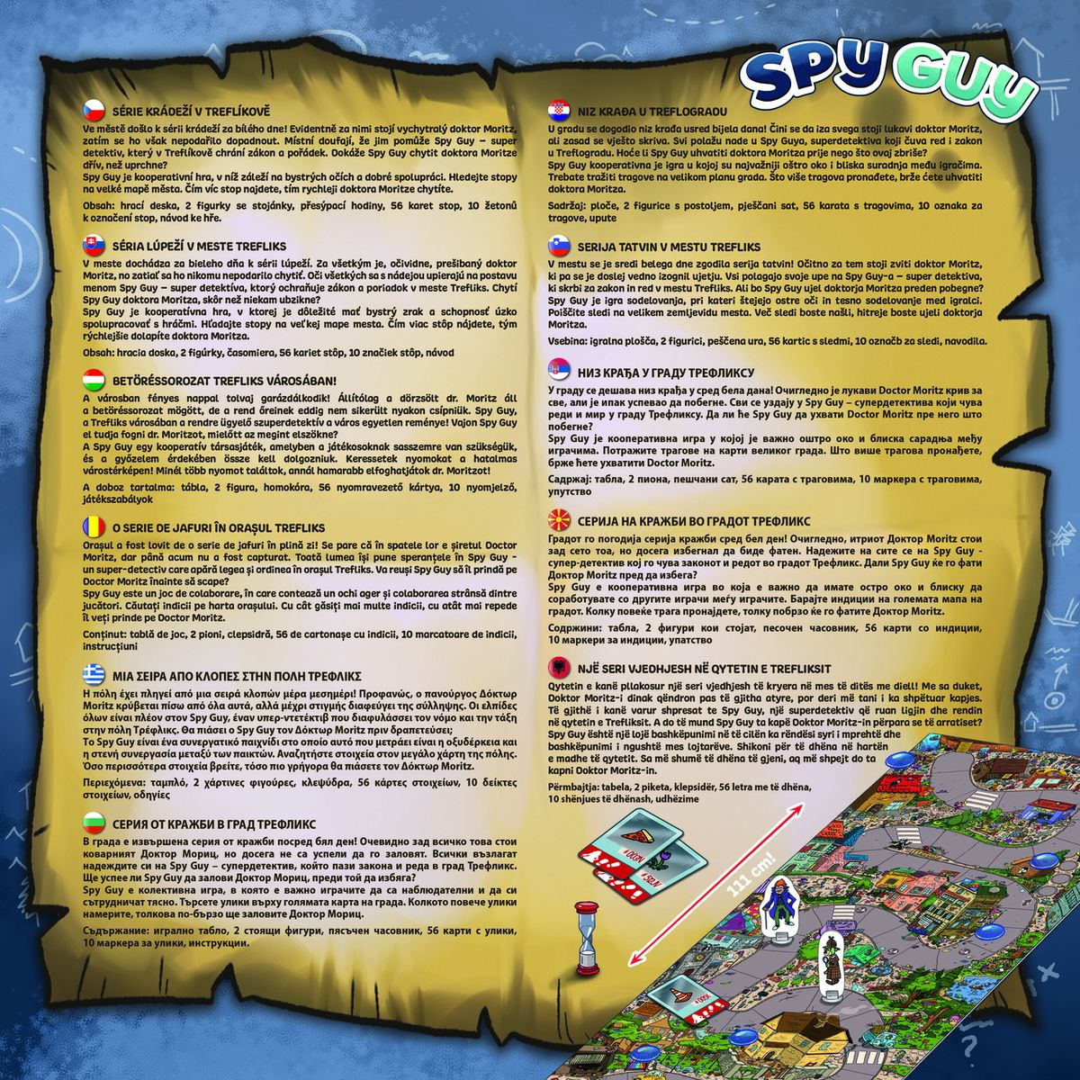 Ve městě došlo k sérii krádeží za bílého dne... Evidentně za nimi stojí vychytralý doktor Moritz, zatím se ho však nepodařilo dopadnout. Místní doufají, že jim pomůže Spy Guy - super detektiv, který v Treflíkově chrání zákon a pořádek. Dokáže Spy Guy chytit doktora Mortize dřív, než uprchne? Spy Guy je kooperativní hra, v níž záleží na bystrých očích a dobré spolupráci. Hledejte stopy na velké mapě města. Čím víc stop najdete, tím rychleji doktora Mortize chytíte. Obsah balení: hrací deska, 2 figurky se stojánky, přesýpací hodiny, 56 karet stop, 10 žetonů k označení stop, návod. Velikost balení: 26 x 26 x 6 cm Vhodné pro děti od 5 let