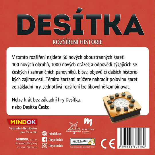 Skvělá vědomostní hra Desítka se dočkala pokračování a přichází s otázkami šitými na míru přímo naší vlasti. Česko je samostatně hratelné; samozřejmě ale není problém promíchat původní karty s těmi novými. Vědomostní hra, ve které hráči nemusejí čekat na svůj tah tak dlouho jako v jiných hrách. Ke každému okruhu ve hře přísluší 10 otázek