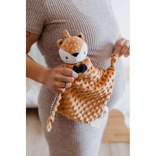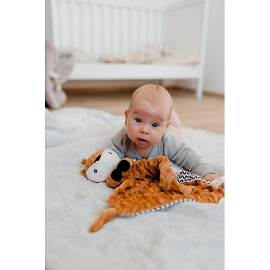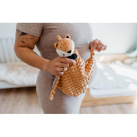 Roztomilý plyšový usínáček ve tvaru srnečka je ideálním společníkem pro nejmenší miminka již od narození. Měkoučká látka typu minky s 3D puntíky poskytuje příjemný dotek, který miminko uklidňuje a podporuje jeho smyslový rozvoj. Součástí je také měkké kousátko vhodné při prořezávání zoubků a jemné chrastítko, které podporuje zvědavost a rozvíjí sluchové vnímání. Usínáček je navíc certifikován v ČR, takže splňuje přísné požadavky na bezpečnost pro ty nejmenší.