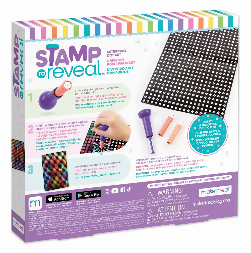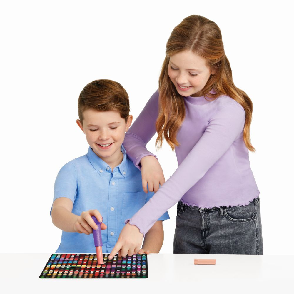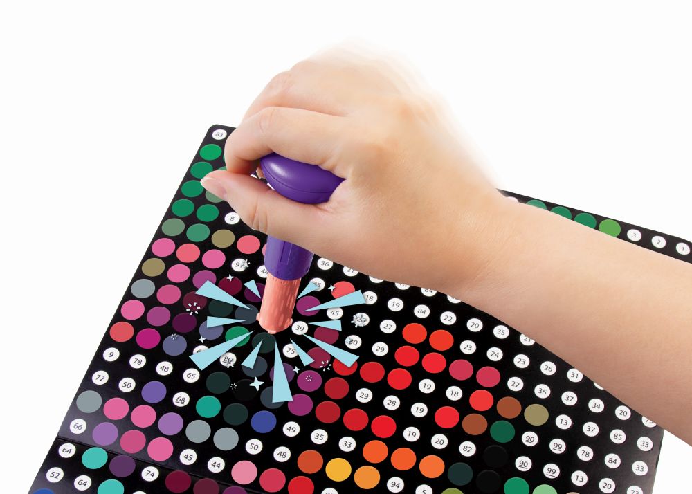 Užijte si uspokojující potěšení z vytváření vlastního tečkovaného plakátu! Podívejte se na razítko na číslo na papírové tečce a na plakátu najděte odpovídající číslo. Zarovnejte kruhy a razítko! Pokračujte v odhalování jednoho barevného tečkového uměleckého plakátu, který můžete zavěsit a užívat si. Každá sada obsahuje vše potřebné k odhalení uměleckého díla se zářícím drakem, včetně razítka, tečkovaných kazet a 600 teček. Zažijte větší spokojenost s každým razítkem a obdivujte odměňující výsledek. Stamp To Reveal™ Satisfying Dot Art je skvělý dárek pro trendy doplnění, ať už k narozeninám, svátku nebo jen tak. Ideální pro věk 6+. Sbírejte je všechny!