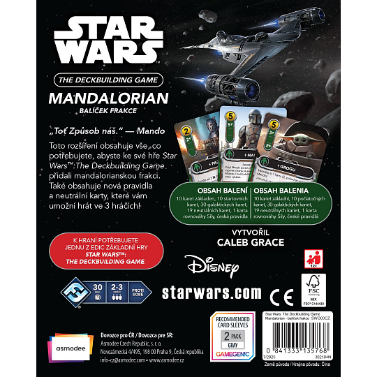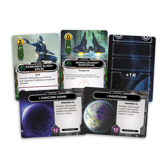 Rozšíření Mandalorian obsahuje vše, co potřebujete, abyste ke své hře STAR WARS™: THE DECKBUILDING GAME přidali mandalorianskou frakci: 10 karet základen, 10 startovních karet, 30 galaktických karet a 1 oboustrannou kartu rovnováhy Síly.