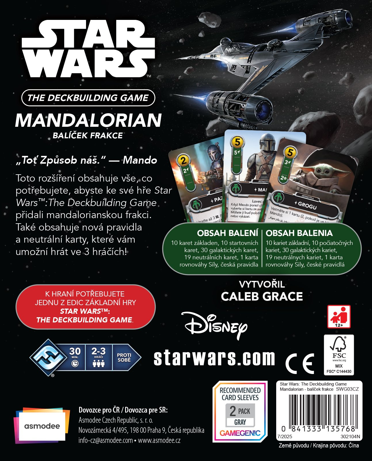 Rozšíření Mandalorian obsahuje vše, co potřebujete, abyste ke své hře STAR WARS™: THE DECKBUILDING GAME přidali mandalorianskou frakci: 10 karet základen, 10 startovních karet, 30 galaktických karet a 1 oboustrannou kartu rovnováhy Síly.