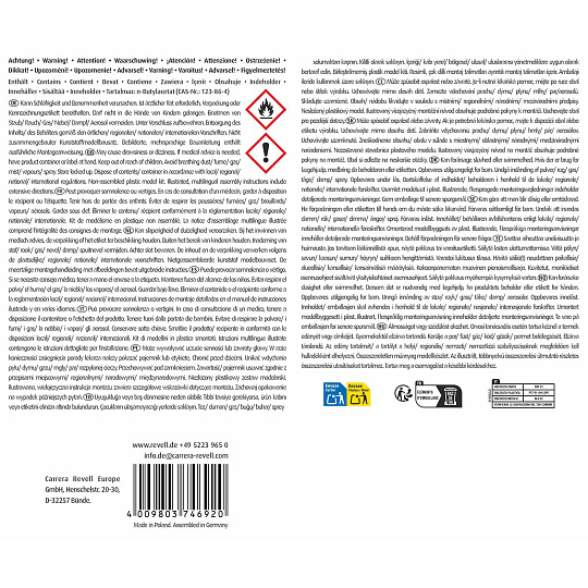 Návod na použití: Vodou ředitelná akrylová barva. Před použitím barvu dobře promíchejte. Nanášejte štětcem, nebo stříkáním na suchý, čistý povrch. Nehořlavá báze, rychle zasychá – nebarvitelné po 1 hodině, úplně uschne za 2–3 hodiny, podle tloušťky vrstvy. V případě potřeby zřeďte vodou. Použitím nevhodného ředidla se může barva zničit! Čistí se ředidlem Revell Aqua Color Clean. Na stříkání se doporučuje ředění maximálně 20 - 25 %. Štětec a pomůcky ihned po použití vypláchněte vodou. Nádobku po použití pevně uzavřete. Po otevření spotřebujte co nejdříve, barva přístupem vzduchu zasychá. Chraňte před mrazem. Obsahuje Směs látek 5-chlor-2methylisothiazol-3(2H)on a 2-methylizothiazol3(2H)-on s chloridem hořečnatým a dusičnanem hořečnatým. Může vyvolat alergickou reakci.
