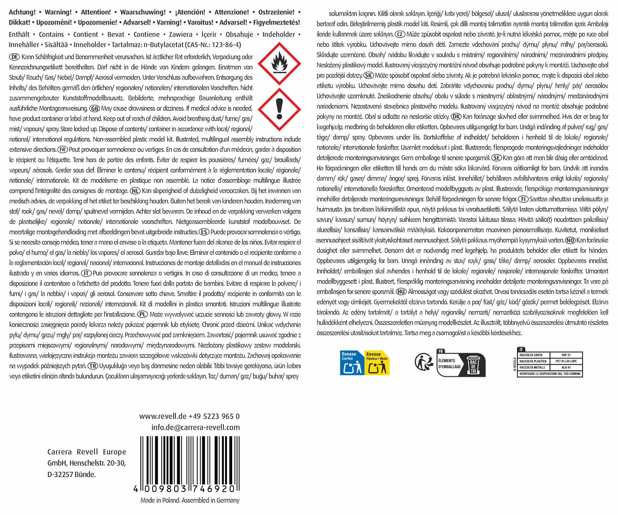 Návod na použití: Vodou ředitelná akrylová barva. Před použitím barvu dobře promíchejte. Nanášejte štětcem, nebo stříkáním na suchý, čistý povrch. Nehořlavá báze, rychle zasychá – nebarvitelné po 1 hodině, úplně uschne za 2–3 hodiny, podle tloušťky vrstvy. V případě potřeby zřeďte vodou. Použitím nevhodného ředidla se může barva zničit! Čistí se ředidlem Revell Aqua Color Clean. Na stříkání se doporučuje ředění maximálně 20 - 25 %. Štětec a pomůcky ihned po použití vypláchněte vodou. Nádobku po použití pevně uzavřete. Po otevření spotřebujte co nejdříve, barva přístupem vzduchu zasychá. Chraňte před mrazem. Obsahuje Směs látek 5-chlor-2methylisothiazol-3(2H)on a 2-methylizothiazol3(2H)-on s chloridem hořečnatým a dusičnanem hořečnatým. Může vyvolat alergickou reakci.