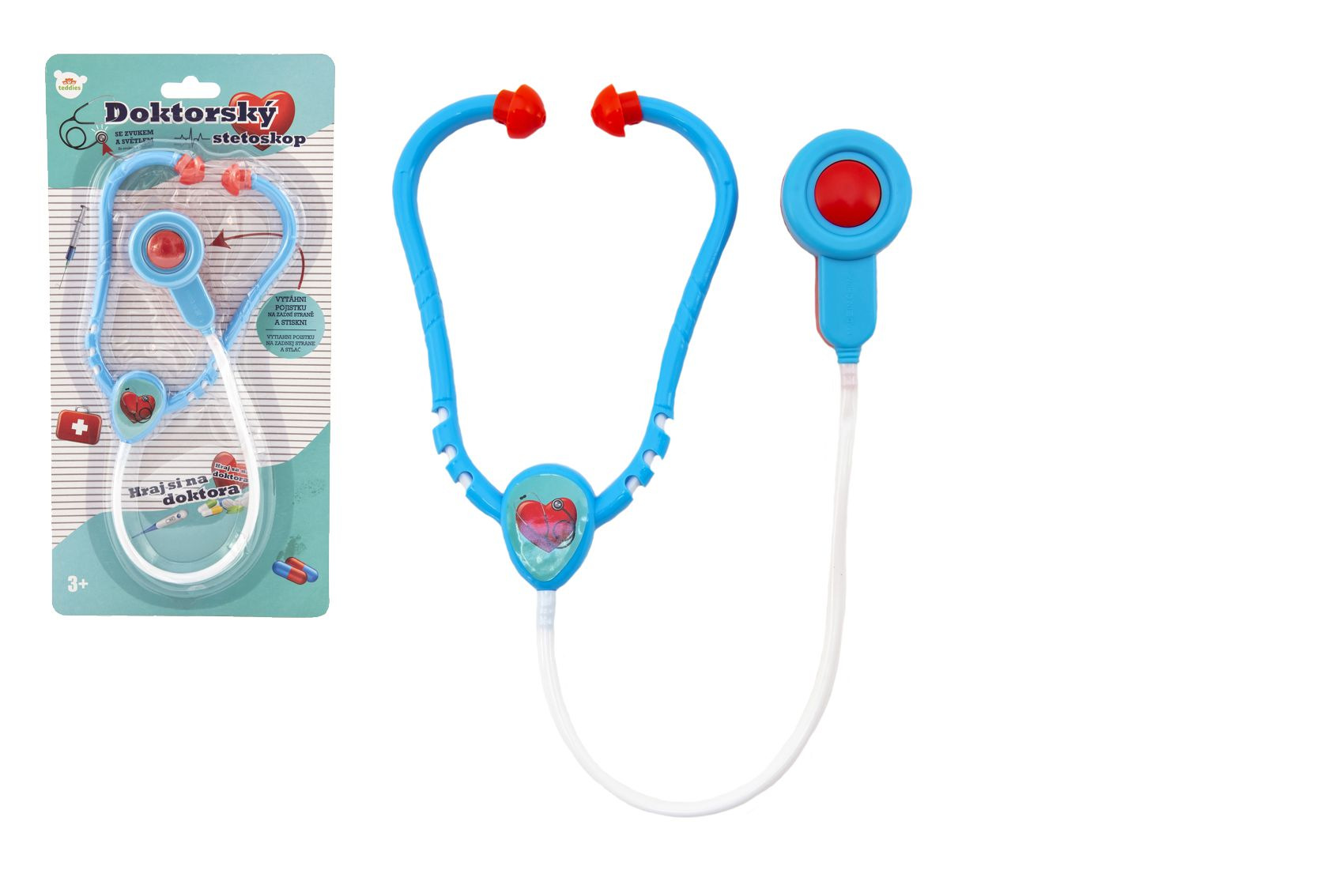 Potřebujete vyšetřit Vaše kamarády nebo rodinu? V tom případě tento stetoskop na baterie se světlem a zvukem je ten pravý! Přilož stetoskop na srdce pacienta a uslyšíš, jak mu tluče srdce! Perfektní doplněk do dětské ordinace, na karneval nebo jen tak ke hře na doktora. Podporuje fantazii, empatii a základní poznávání lidského těla zábavnou formou! Rozměr balení: 17 x 34 x 3 Délka stetoskopu: 53 cm Vhodné pro děti od 3 let
