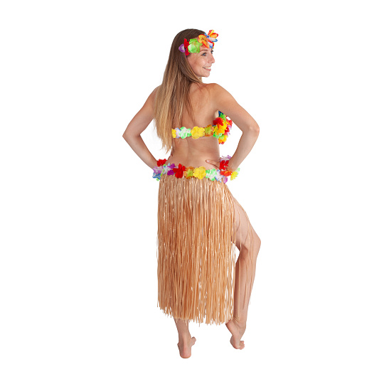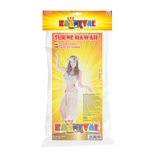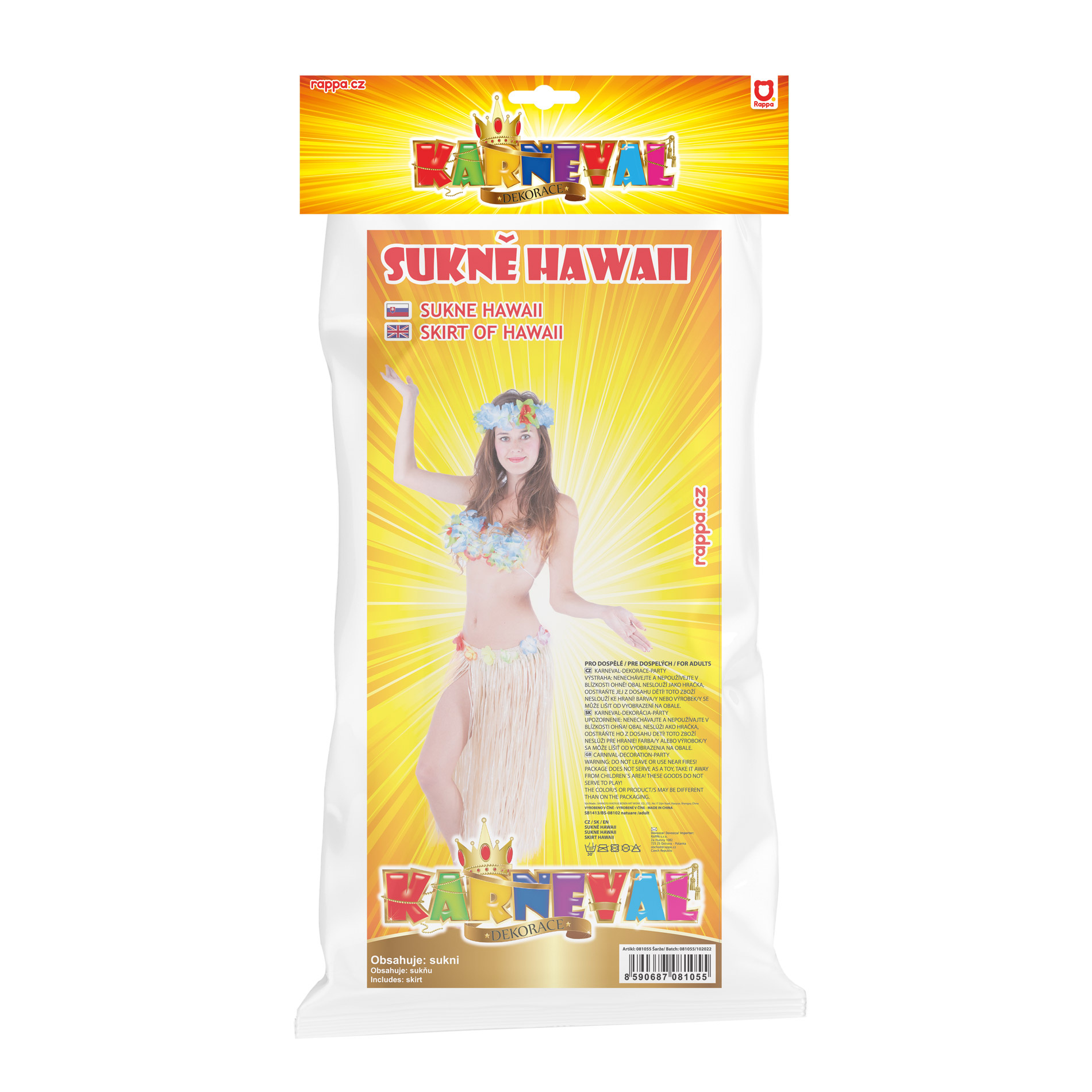 Parádní sukně ve stylu "Havaj" nesmí žádné dámě v šatníku chybět! Tento senzační kousek je ideálním doplňkem na karneval nebo k typickému havajskému tanci "HULA". Sukně, dlouhá 72 cm, je vyrobena z tenkých igelitových pásků v přírodní barvě a zdobena barevnými okvětními lístky. Paráda! Staň se hvězdou karnevalového večírku díky této havajské sukni nebo si vytvoř celý havajský kostým! Balení obsahuje pouze sukni.