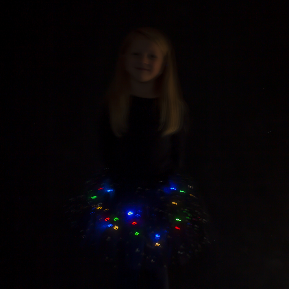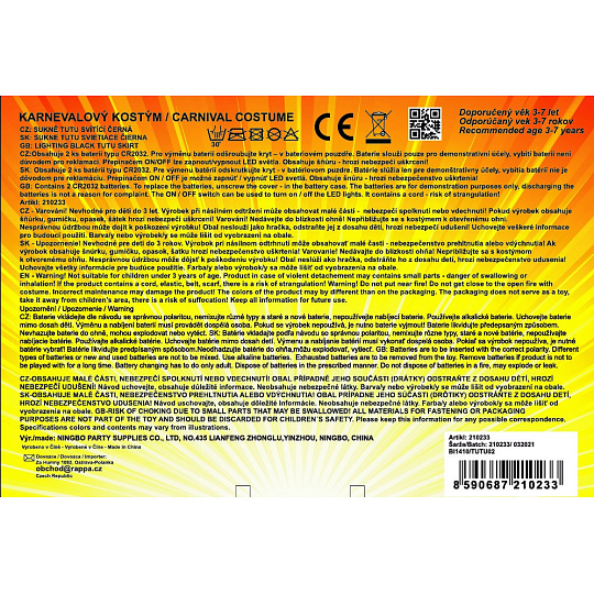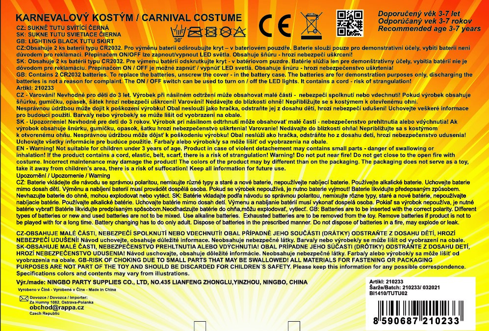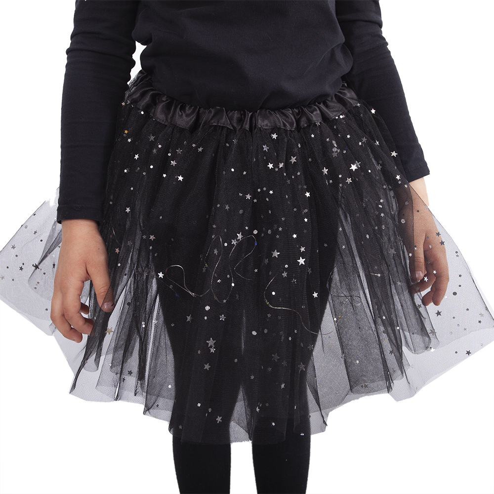 Úchvatná sukně tutu pro všechny malé parádnice! Sukýnka černé barvy je určena pro holčičky ve věkovém rozmezí 3-7 let (104-146 cm). Nadýchaná tylová suknička je zdobena saténovou gumou a zdobena flitry, součástí jsou barevná světýlka, která po zapnutí svítí. Baterie jsou součástí. Délka sukně cca 32 cm.