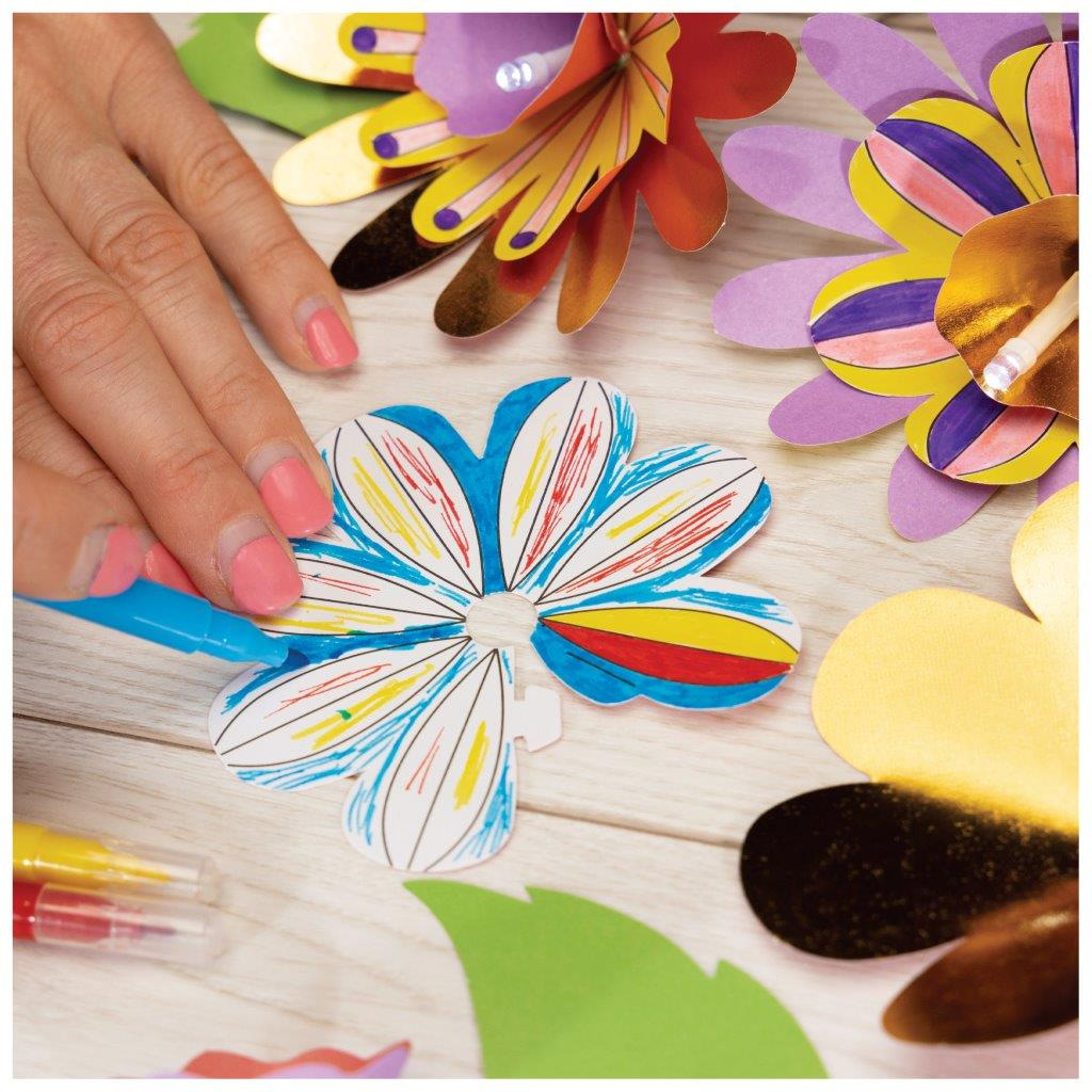Vybarvi vzorované kytičky a na každé LED světlo naskládej různé vrstvy vzorovaných, barevných a metalických kytiček pro vytvoření zářivého řetězu.