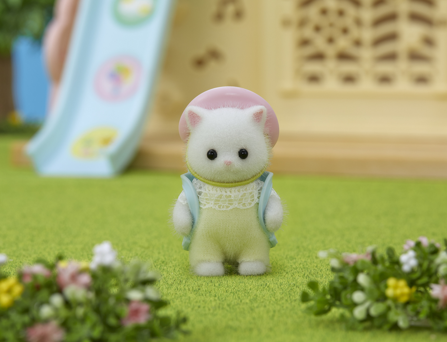 Dětské hřiště s bazénem je oblíbeným místem pro hraní dětí ze školky Sylvanian Families. Barevné schodiště vede k hradní věži. Velkým oknem vidíte na bazén nebo pískoviště. Děti si mohou okamžitě sklouznout dolů zatočenou skluzavkou. Sada obsahuje roztomilé hračky pro hraní na pískovišti a