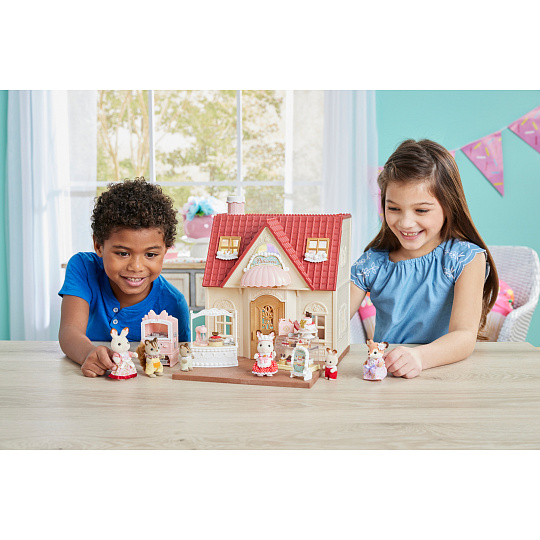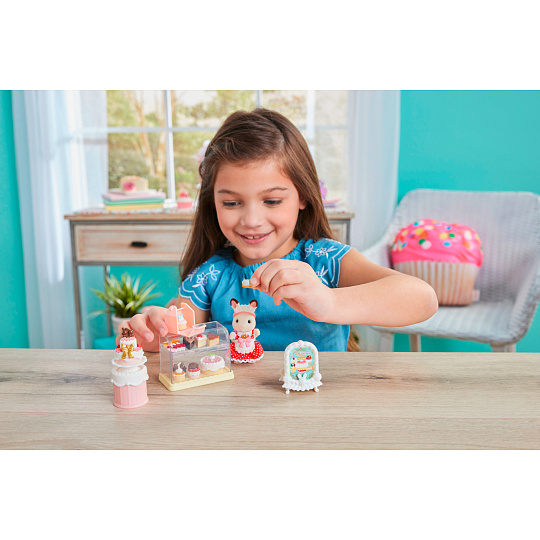 Zveme vás do cukrárny plné sladkostí, kde se sladké sny stávají skutečností. Sada obsahuje vybavení cukrárny a spoustu dortů, dekorací a dalších doplňků, které promění útulný venkovský domek (prodává se samostatně) v cukrárnu. Připevněte ceduli a markýzu nad dveře a zavěste nadýchané ozdoby do oken na půdě, aby se všichni obyvatelé ze Sylvanian Families dozvěděli, že cukrárna je již otevřena. Sada obsahuje troubu na pečení piškotů, bufet, vitrínu s policemi, podstavec na dort, mixér a plechy na pečení. V sadě najdete spoustu doplňků, širokou škálu sladkých krémů a ozdob na dorty, díky kterým můžete vytvořit více než 100 kombinací lahodných pečiv. Hotové dorty jsou elegantně vystaveny ve vitríně nebo v bufetu. Sladkosti lze bezpečně zabalit do krabičky pomocí kleští. Přesně jako v opravdové cukrárně! Sada obsahuje také elegantní zástěru a čelenku do vlasů. Hračky Sylvanian Families rozvíjejí představivost a povzbuzují děti k hraní rolí. Hra s figurkami rozvíjí kreativitu a učí emocím vy... více