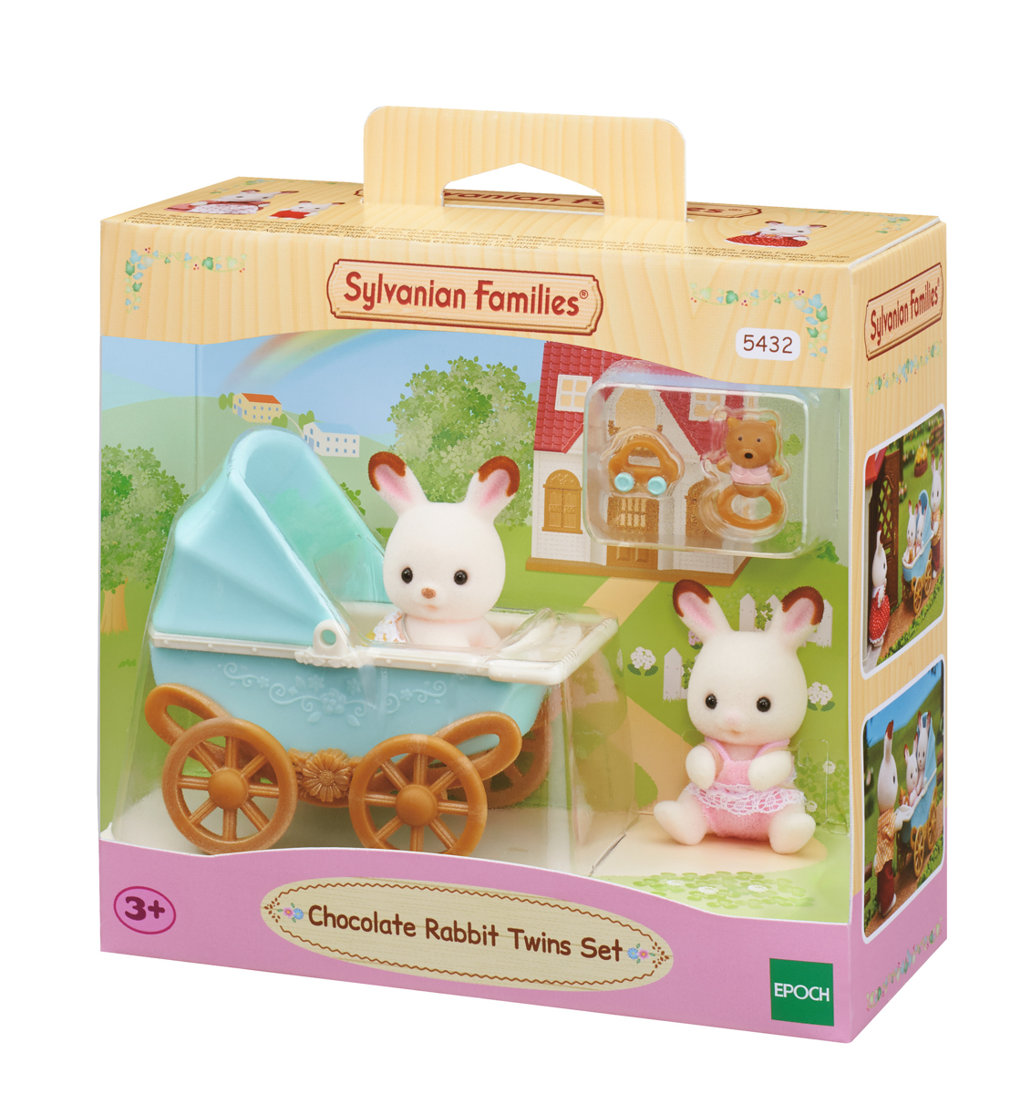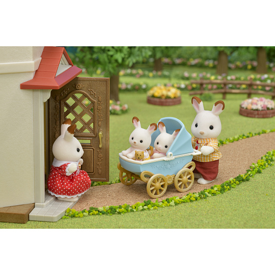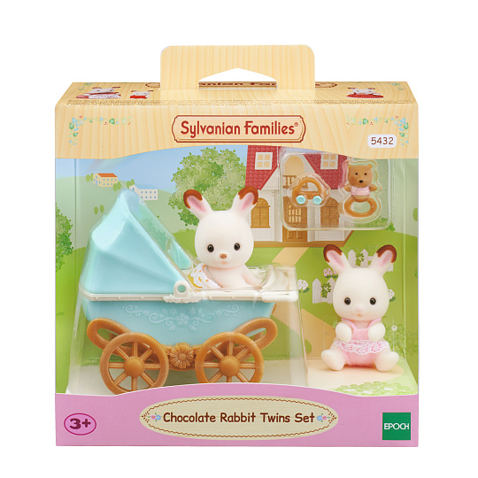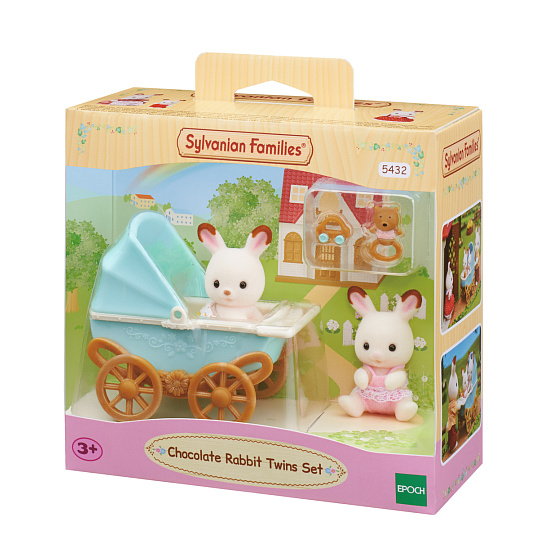 Sada čokoládových králíčků dvojčata je roztomilá sada skládající se z dvojčat čokoládových králíků, kočárku a hračky pro snadnou hru. Kola kočárku se při tlačení pohybují a otáčejí. Do kočárku se vejde jedno dvojče. Hlavičky postaviček se mohou otáčet. Figurky jsou potažené jemňounkým semišem. Hrajte společně s dalšími figurkami čokoládových králíků a nábytkovými sadami (prodávají se samostatně) pro ještě nápaditější hru! Vhodné pro děti od tří let.