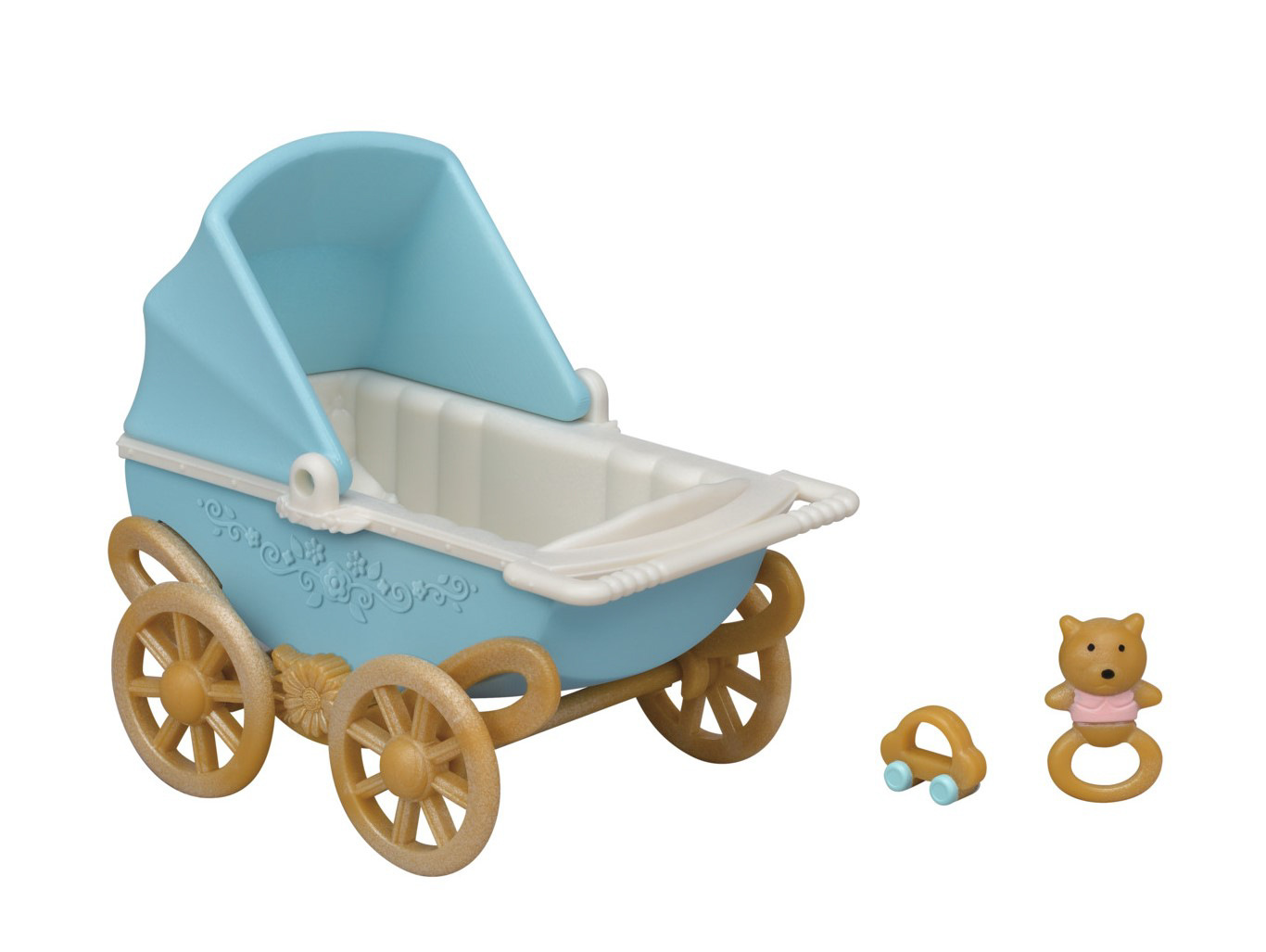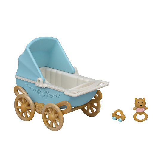 Kočárek s místem pro 2 králíčky – dvojčátka, je dostatečně prostorný. Délka 9 cm a výška boudičky 8,5 cm. Kolečka jsou otáčecí, kočárek jezdí. V kočárku je peřinka pro obě miminka + jedna pokrývka z měkkého materiálu na přikrytí. Miminka jsou vysoká 4 cm, v oblečení, které lze sundat a opětovně navléct. Jedno miminko spinká a druhé klečí a cumlá dudlík. V případě pláče je po ruce chrastítko nebo dudlíček a na hlad zabere láhev s mlíčkem. Set obsahuje: kočárek, peřinku a 4 doplňky pro miminka - 2 chrastítka, dudlík, láhev s mlékem. Věk: 3+