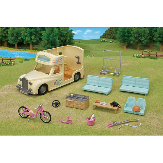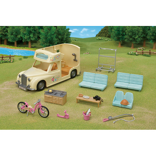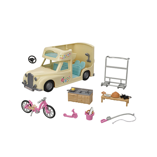 Obsahuje: 1x Obytný vůz, 2x sedačka/postel, 1x dětská sedačka, 1x kuchyňský kout, 1x stůl, 1x pánev, 1x kukuřice, 1x grilovaná ryba, 1x dětské horské kolo, 1x dětské kolo, 1x helma, 1x rybářský prut, 1x kbelík, 1x ryba, 1x dalekohled, 1x zadní nosič. Věk: 3+.