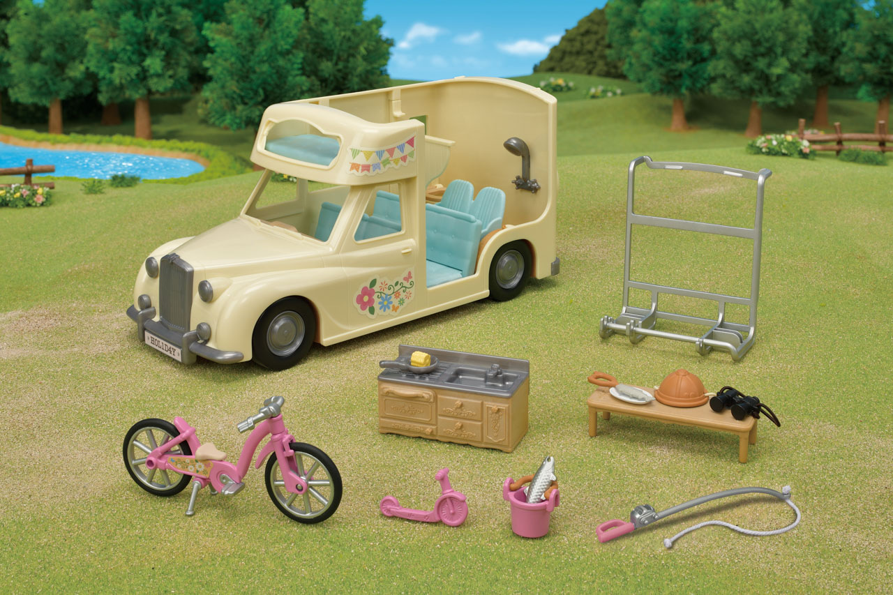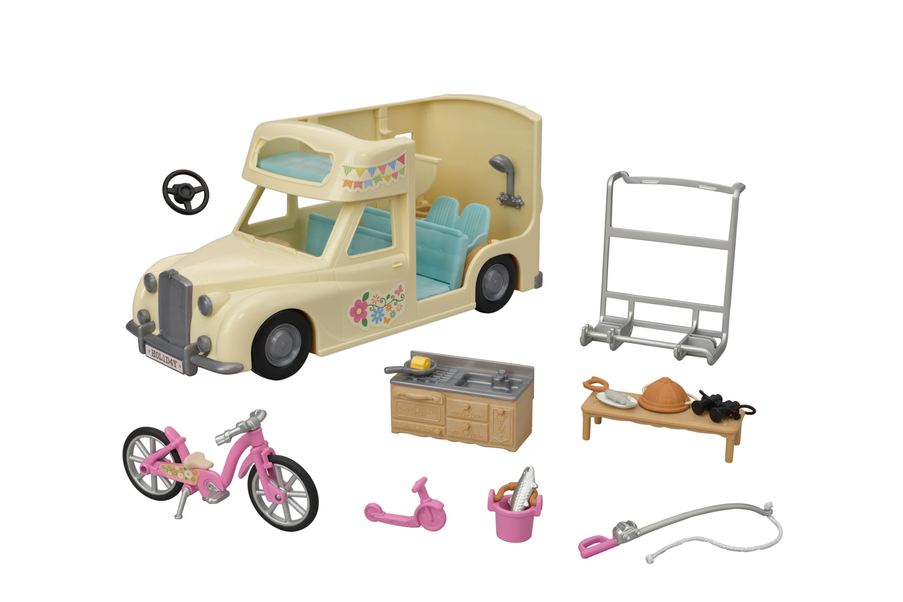 Obsahuje: 1x Obytný vůz, 2x sedačka/postel, 1x dětská sedačka, 1x kuchyňský kout, 1x stůl, 1x pánev, 1x kukuřice, 1x grilovaná ryba, 1x dětské horské kolo, 1x dětské kolo, 1x helma, 1x rybářský prut, 1x kbelík, 1x ryba, 1x dalekohled, 1x zadní nosič. Věk: 3+.