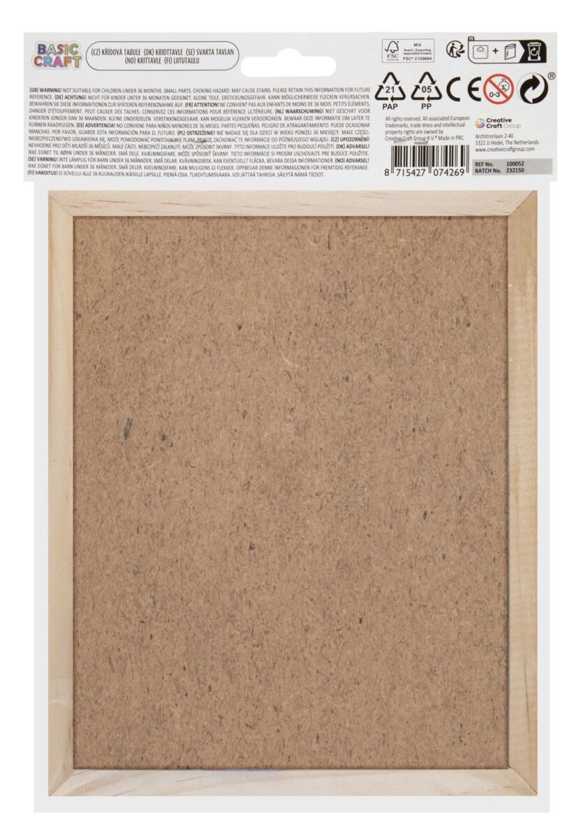 Dřevěná školní tabulka na křídy o rozměrech 20x16 cm, součástí balení jsou i 4 barevné křídy a houbička na mazání tabule