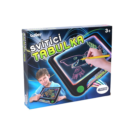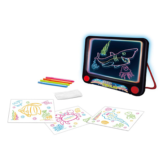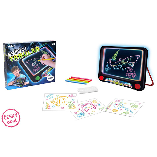 Kreslící tabulka svítící. 3xAAA baterie nejsou součástí. Velikost 25,5x23,5x3,5 cm. Návod na krabici. Obsahuje: mazací fixy, hadřík na mazání, šablony.