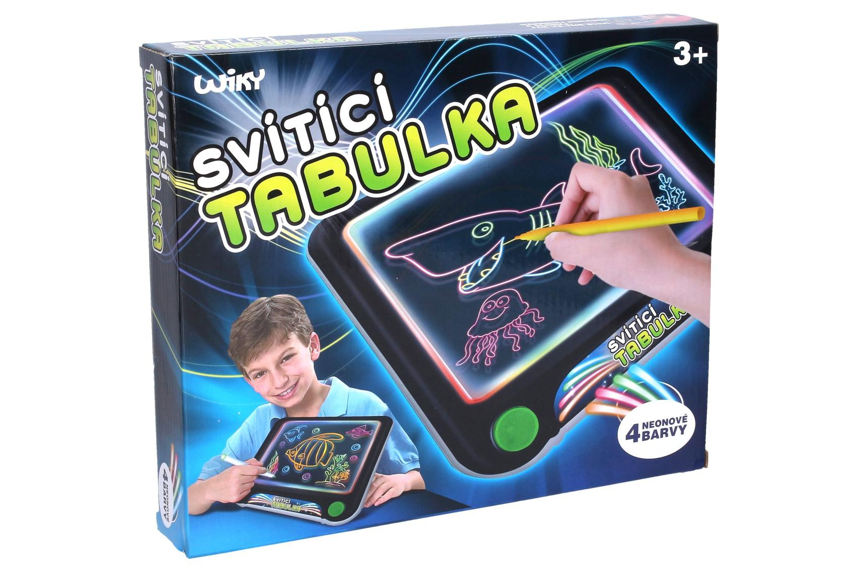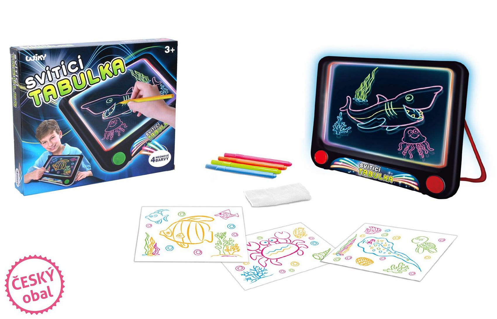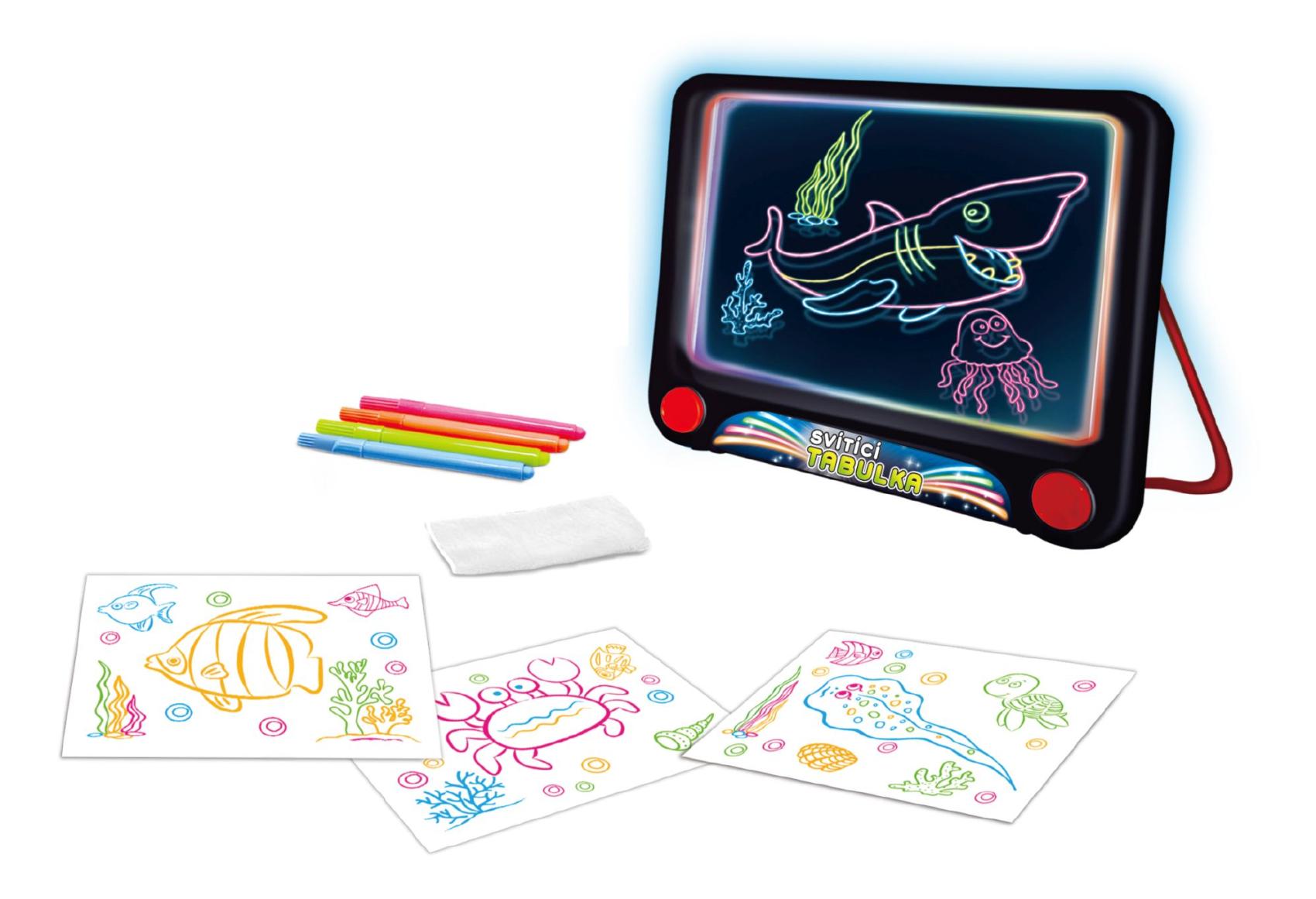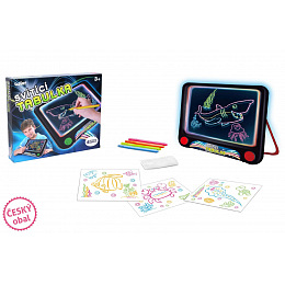 Kreslící tabulka svítící. 3xAAA baterie nejsou součástí. Velikost 25,5x23,5x3,5 cm. Návod na krabici. Obsahuje: mazací fixy, hadřík na mazání, šablony.