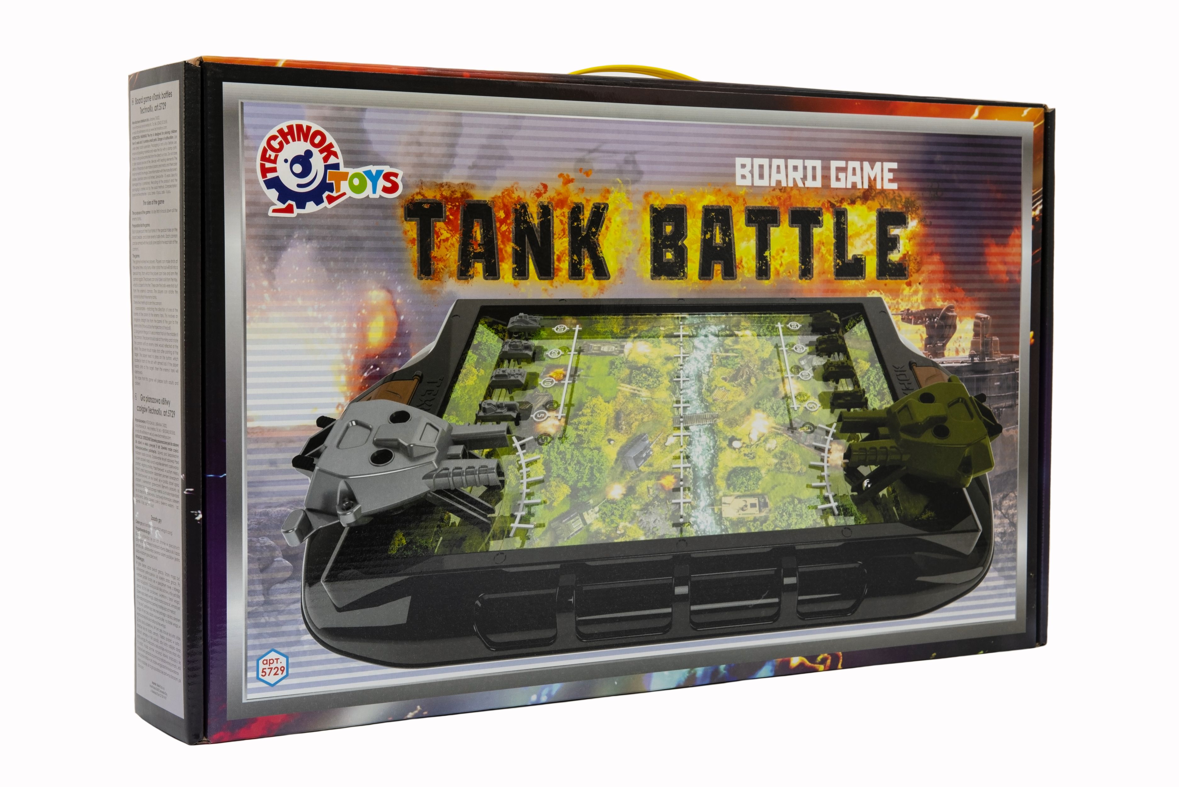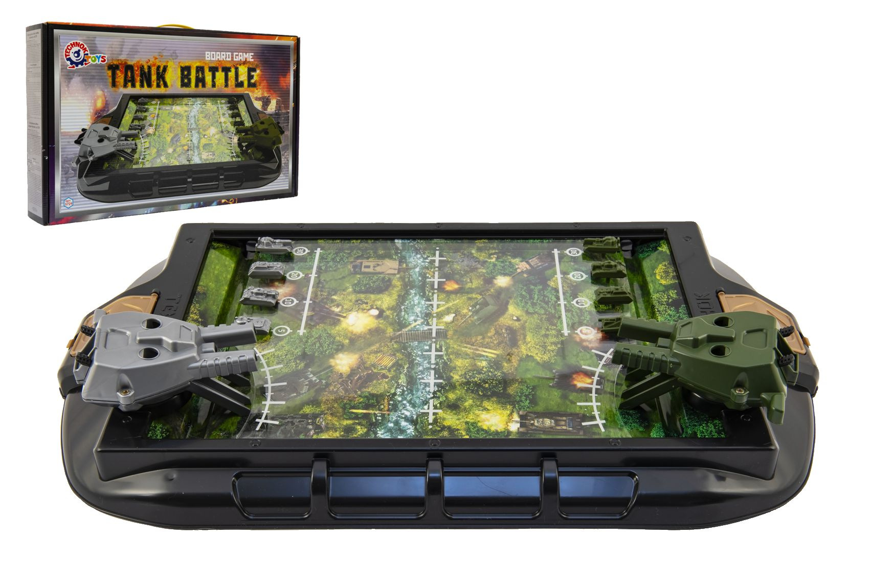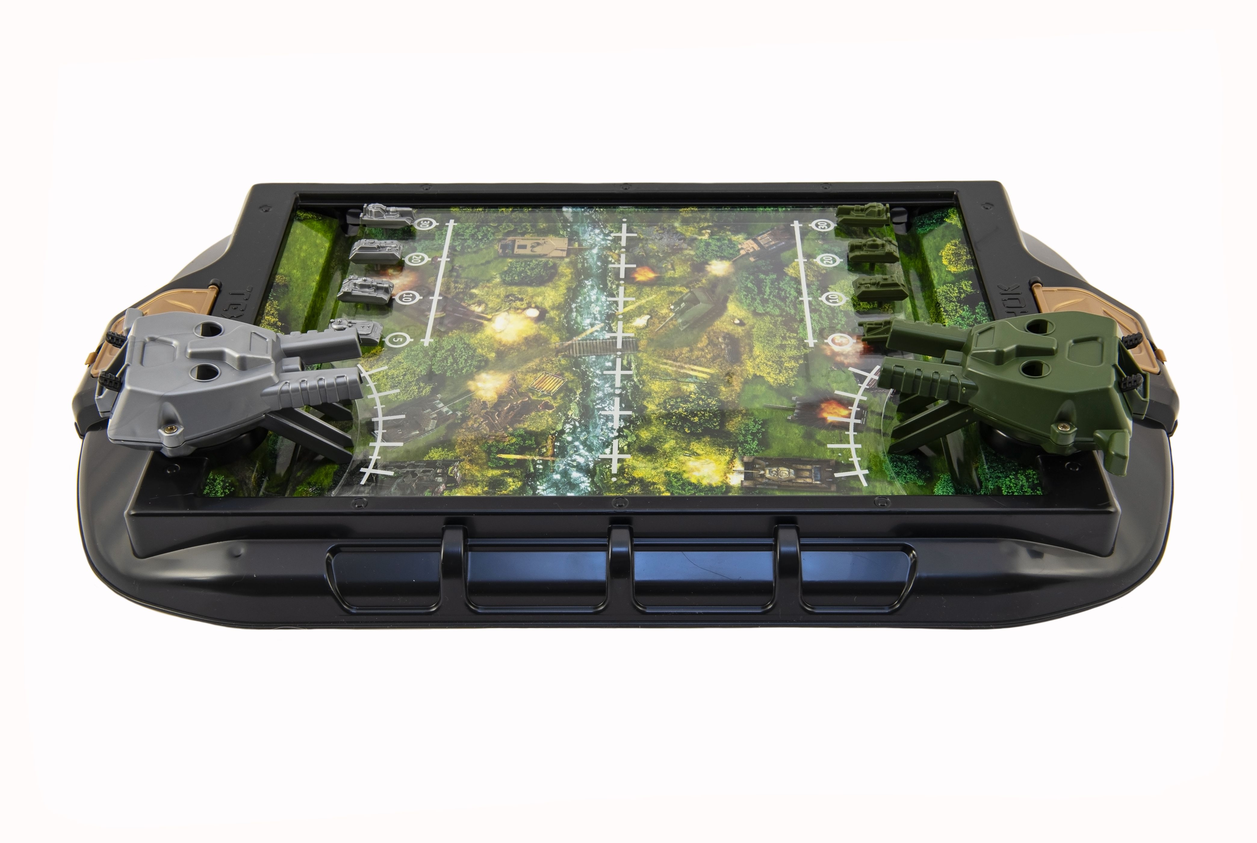 Stolní tanková bitva. Účelem hry je co nejdříve porazit nepřítele. Každý hráč umístí své čtyři tanky do speciálních otvorů na hrací desce vedle sebe a rovnoměrně si rozdělí kuličky. Každé dělo může být vyzbrojeno dvěma míčky (jeden míček v každém slotu děla). Rozměry balení 55 x 33 x 9 cm. Vhodné pro děti od 5 let.