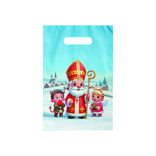 Igelitová taška s průhmatem a barevným mikulášským motivem. Je ideální pro různé typy dárků, od malých sladkostí a hraček až po větší předměty. Na tašce je obrázek Mikuláše, anděla a čerta. Taška je vybavena průhmatem, což je otvor v horní části tašky, který slouží jako rukojeť. Tento průhmat umožňuje snadné a pohodlné přenášení tašky. Díky pevnému plastovému materiálu je taška odolná proti roztržení a vlhkosti, čímž zajišťuje, že dárky uvnitř zůstanou v bezpečí a suchu.