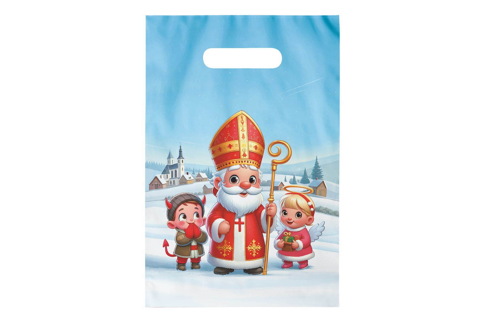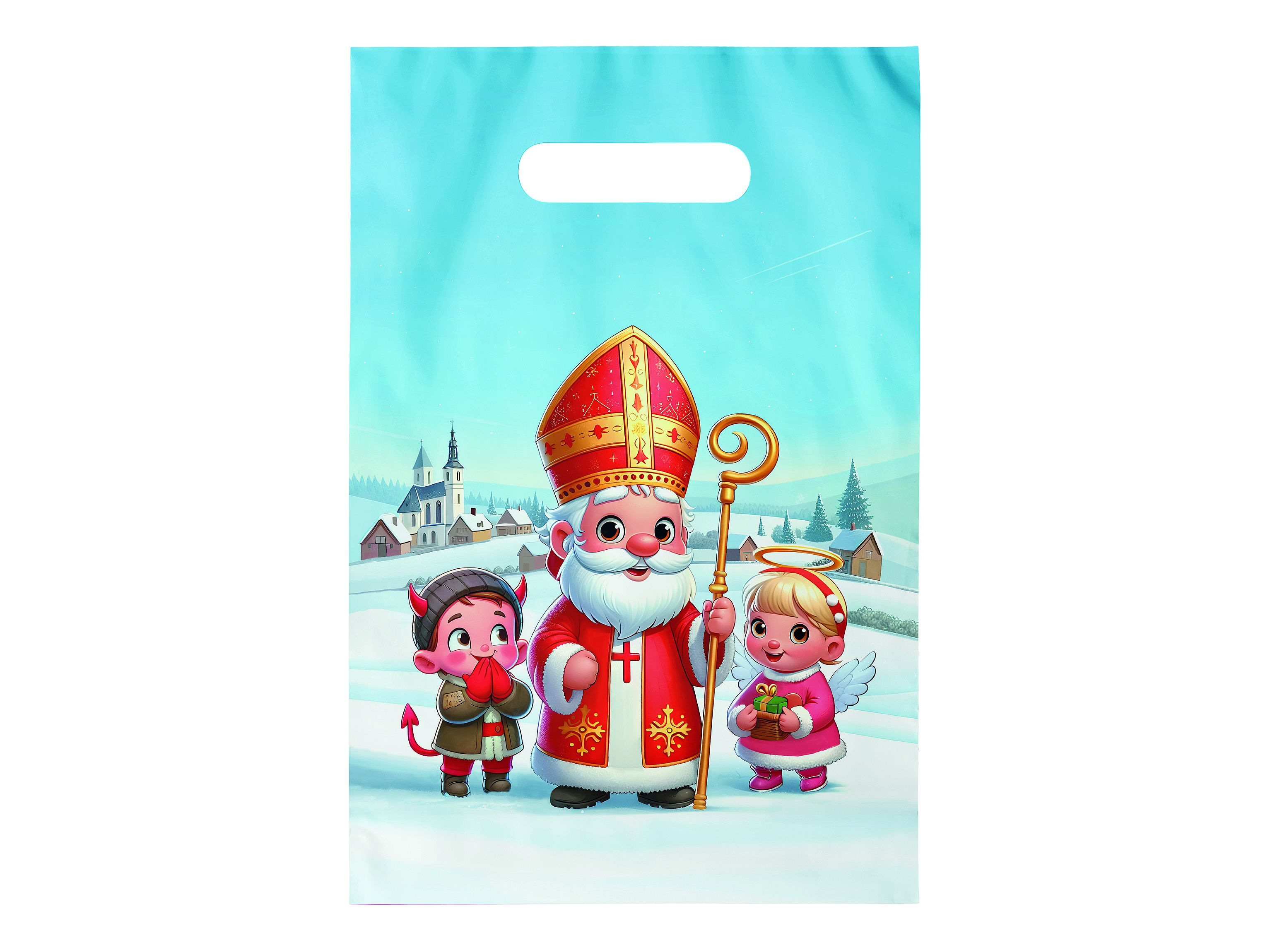 Igelitová taška s průhmatem a barevným mikulášským motivem. Je ideální pro různé typy dárků, od malých sladkostí a hraček až po větší předměty. Na tašce je obrázek Mikuláše, anděla a čerta. Taška je vybavena průhmatem, což je otvor v horní části tašky, který slouží jako rukojeť. Tento průhmat umožňuje snadné a pohodlné přenášení tašky. Díky pevnému plastovému materiálu je taška odolná proti roztržení a vlhkosti, čímž zajišťuje, že dárky uvnitř zůstanou v bezpečí a suchu.