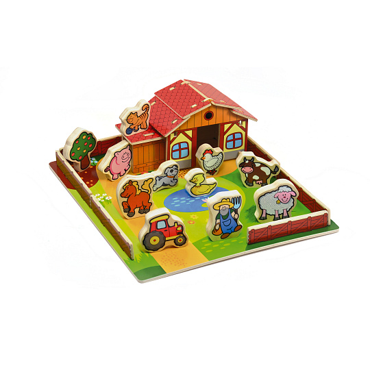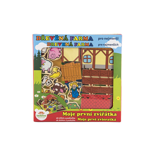 Kvalitní, dřevěná farma, se kterou se děti učí poznávat zvířátka, procvičí motoriku a stimulují logické myšlení. Na dřevěné podložce lze farmu jednoduše sestavit a vytvořit si tak domeček na hraní se spoustou zvířátek. Obsahuje: 28 ks + podložku o velikosti 31 x 31 cm. V krabici. Vhodná od 3 let.