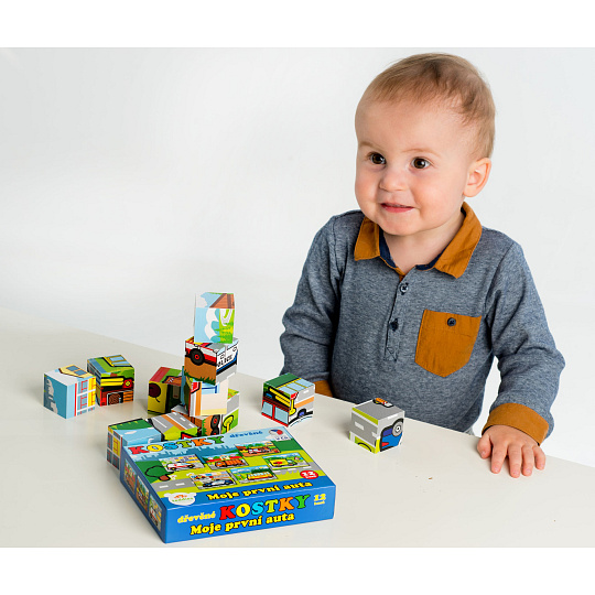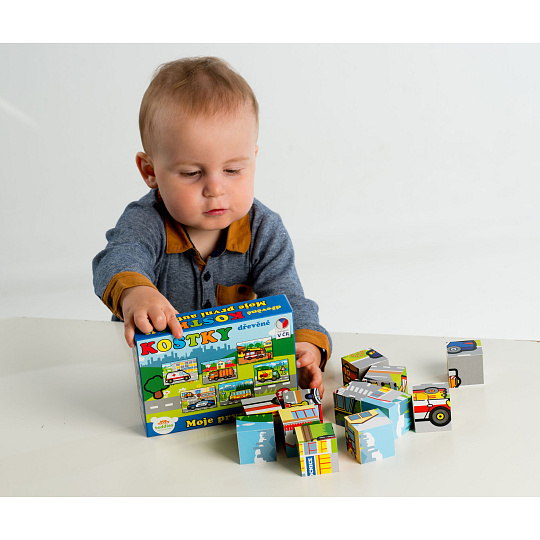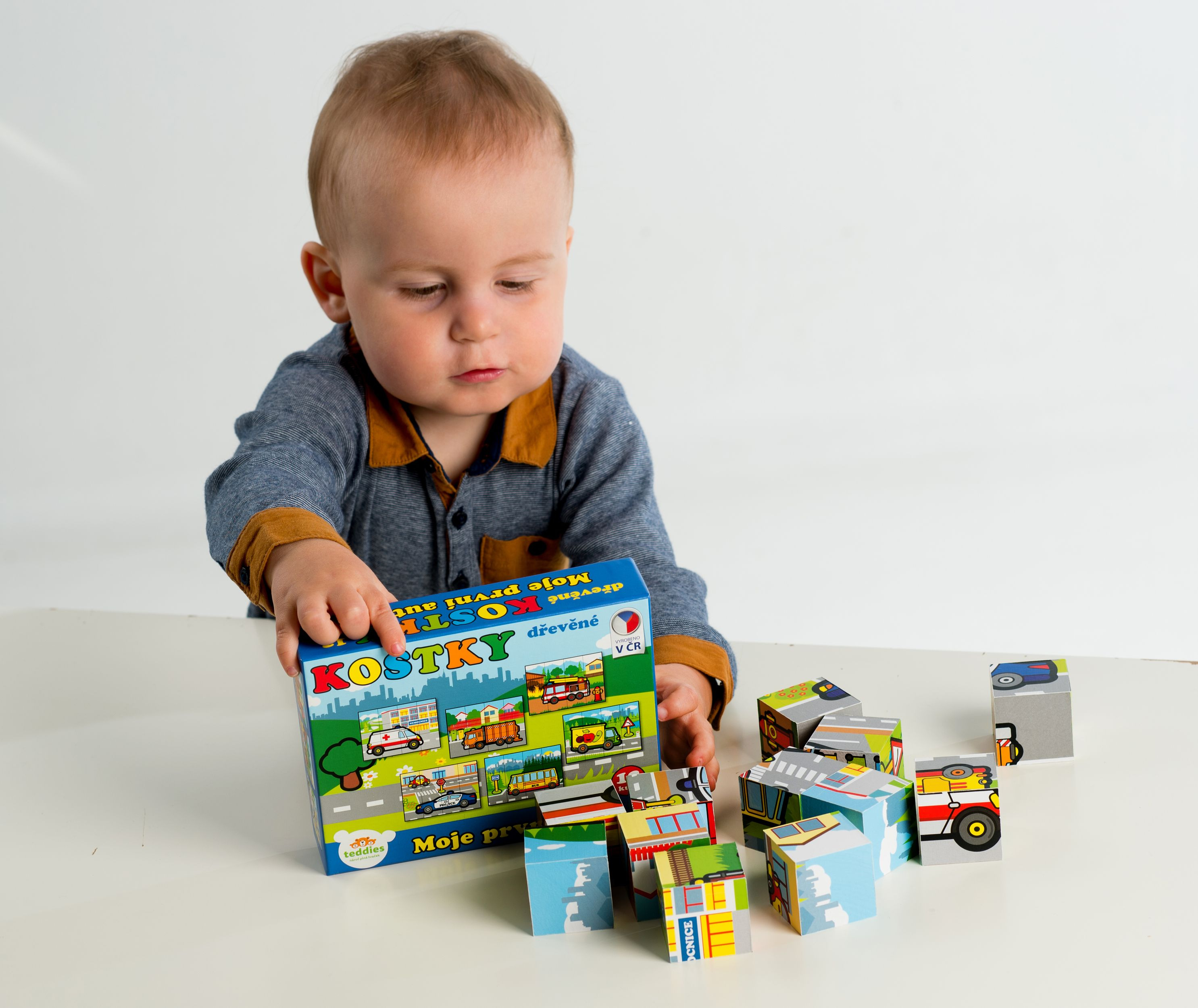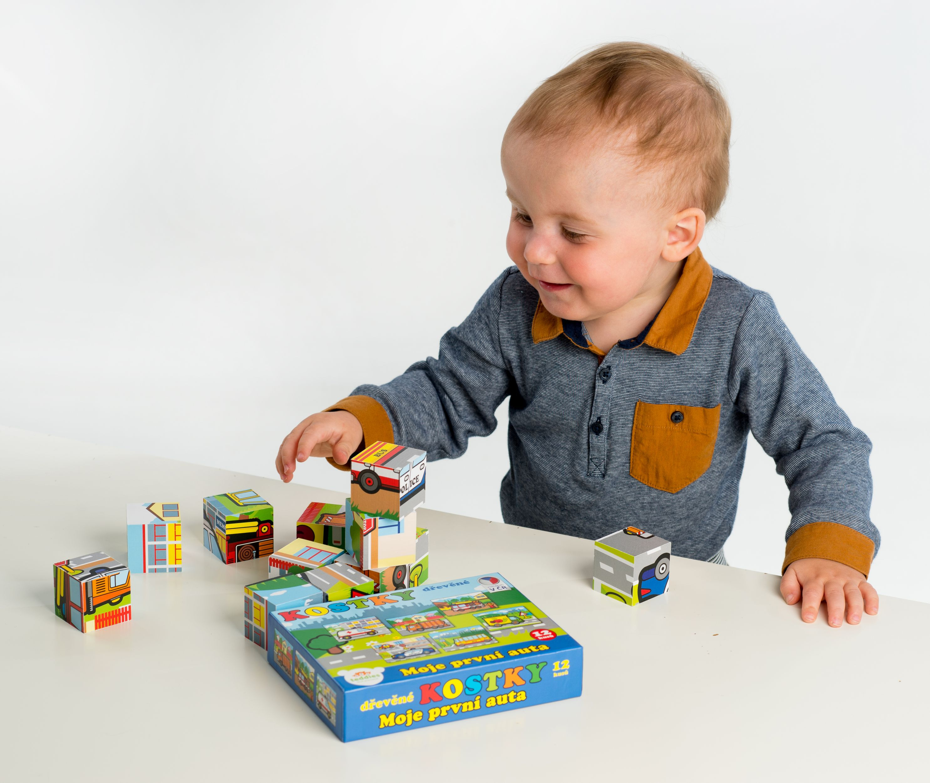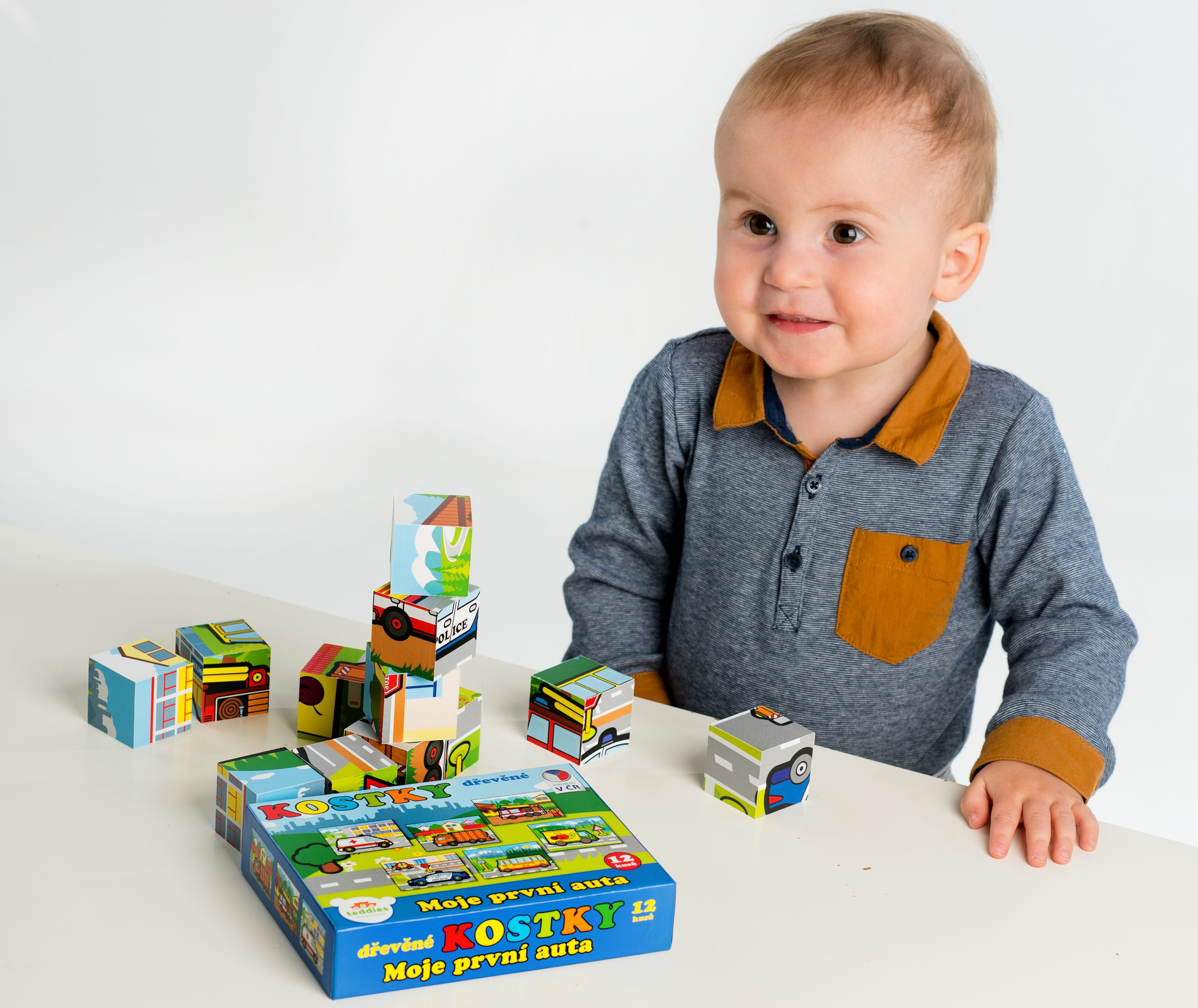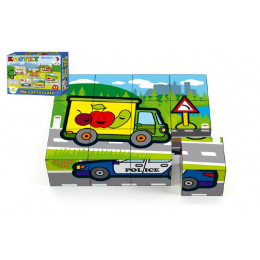 Teddies Kostky kubus dřevěné Moje první auta 12ks v krabičce 17x12,5x4cm