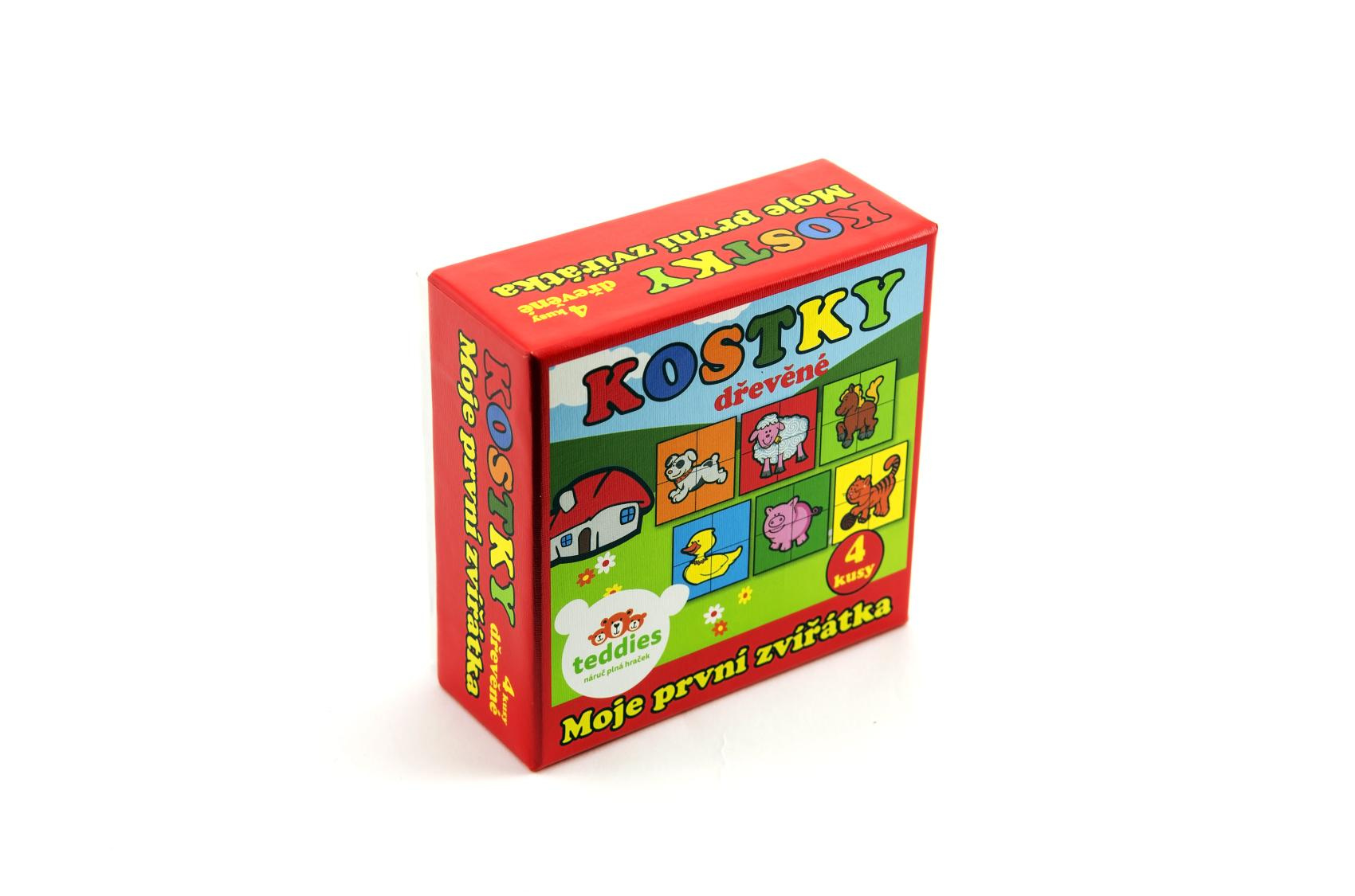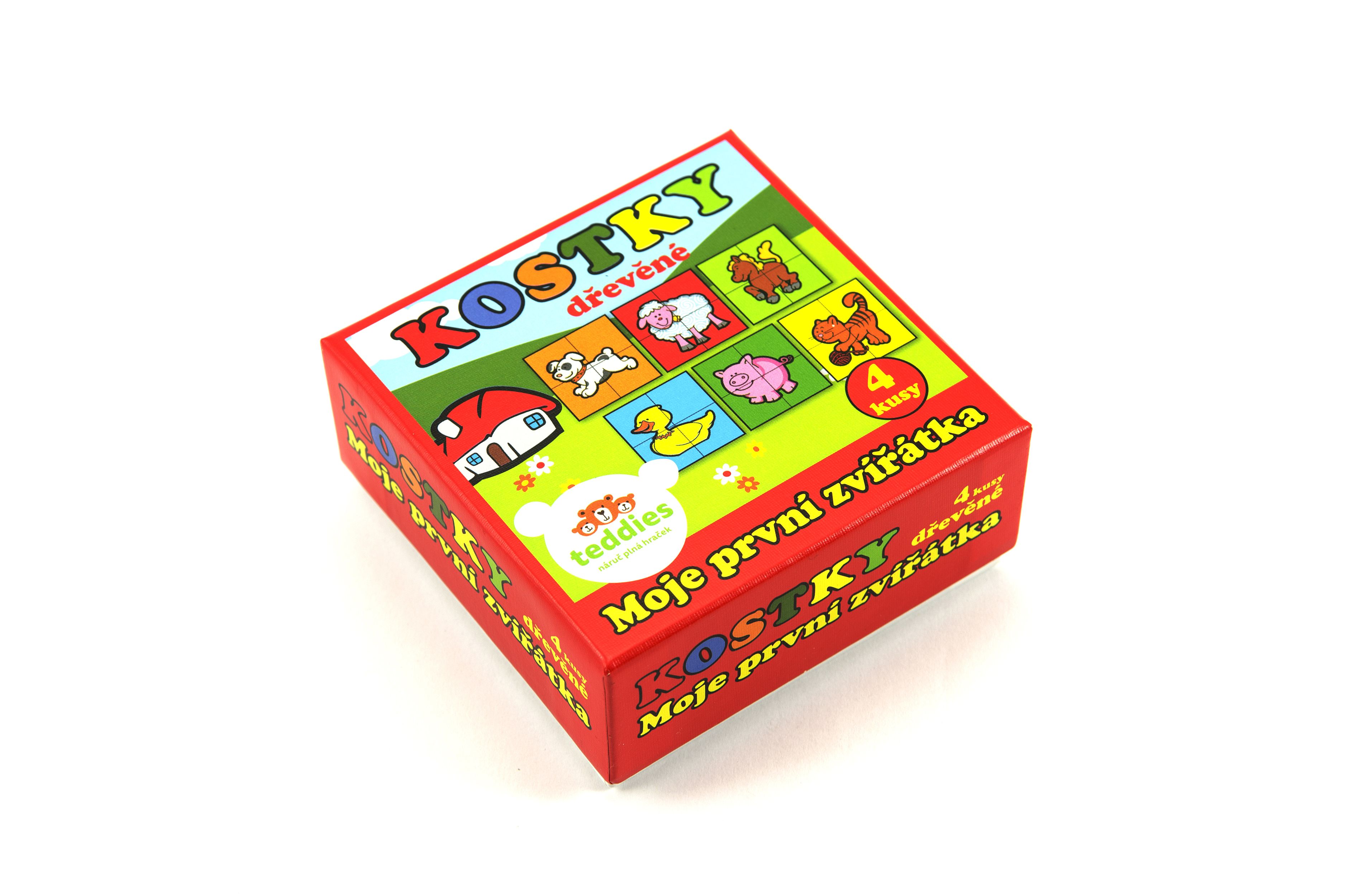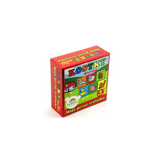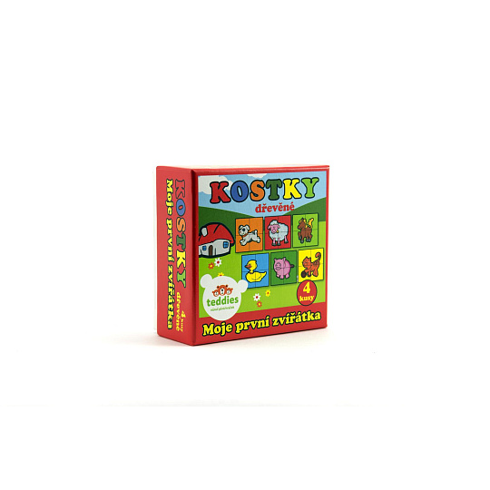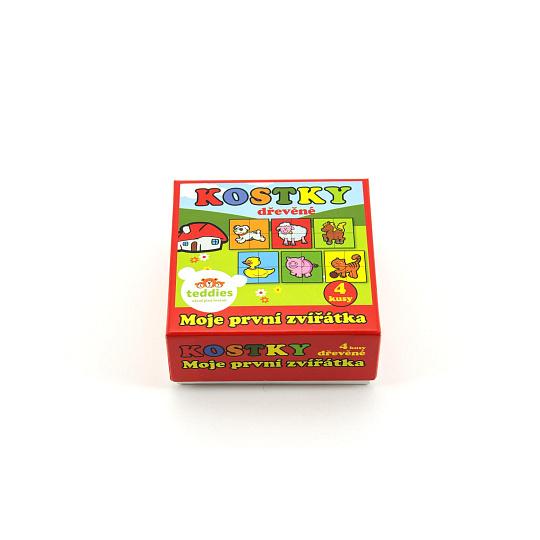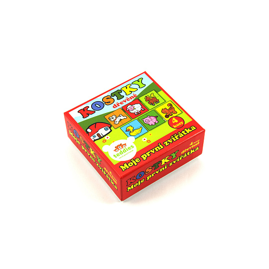 Čtyři dřevěné obrázkové kostky s motivem domácích zvířátek v papírové krabičce, z nichž je možné sestavit šest různých obrázků. Vhodné od 3 let.