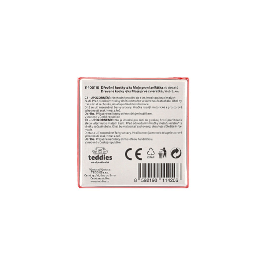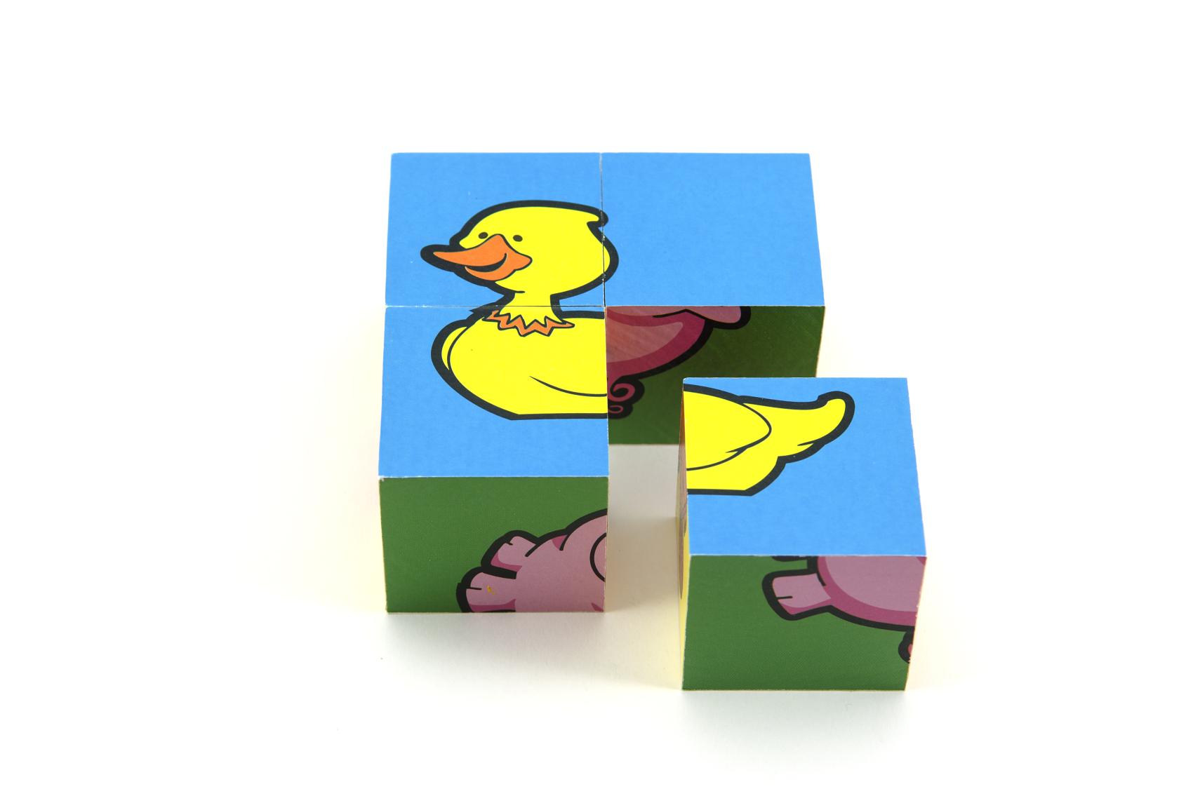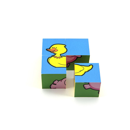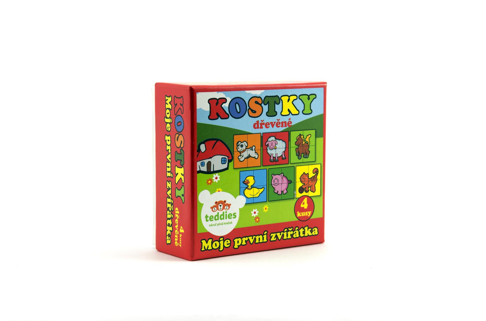 Čtyři dřevěné obrázkové kostky s motivem domácích zvířátek v papírové krabičce, z nichž je možné sestavit šest různých obrázků. Vhodné od 3 let.