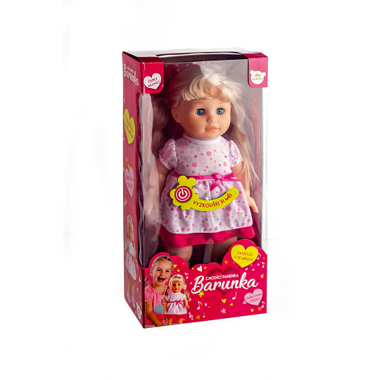 Chodící a mluvící panenka Barunka má krásné dlouhé vlásky, které holčičky mohou česat a vyrábět nejrůznější veselé účesy. Po stisknutí tlačítka na bříšku začne panenka chodit a zpívat: "Ahoj, já jsem Barunka. Zazpíváme si spolu?...Šla Nanynka do zelí…, Pod naším okýnkem..., Červený šátečku... Rozměr panenky: 42 cm Rozměr krabice: 21 x 44 x 11 cm Na baterie - 3 ks typu AA 1,5V - baterie jsou součástí výrobku Vhodné pro děti od 3 let