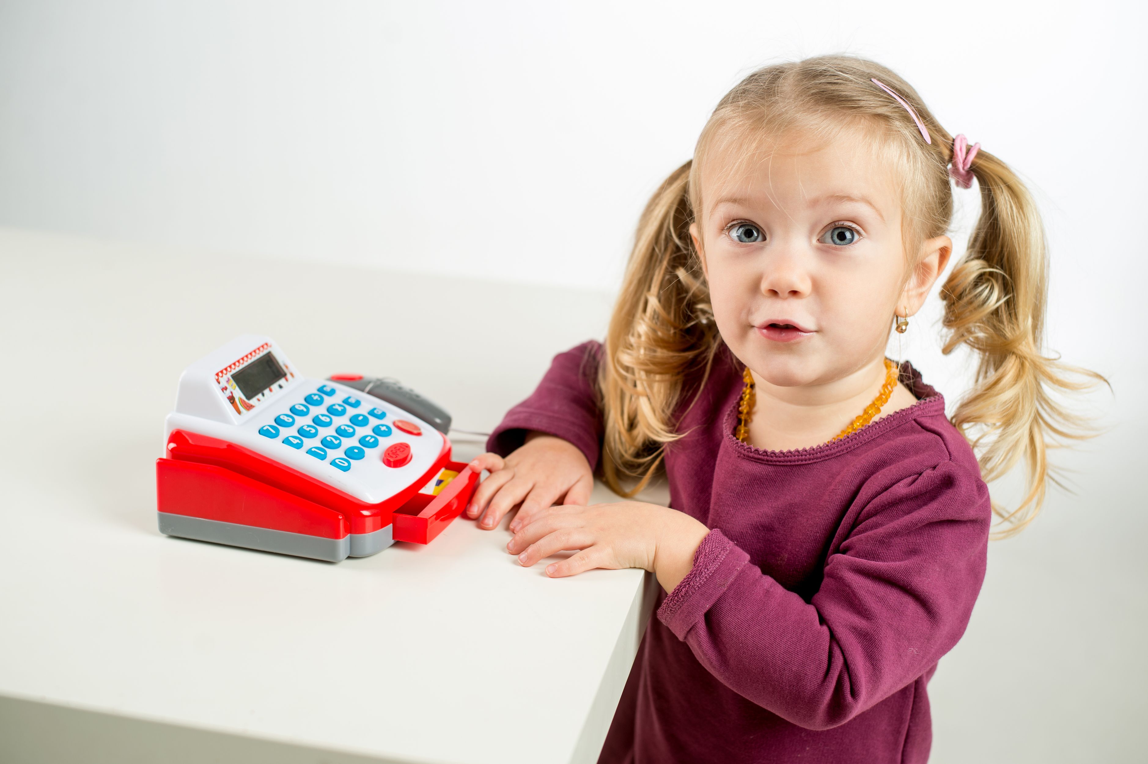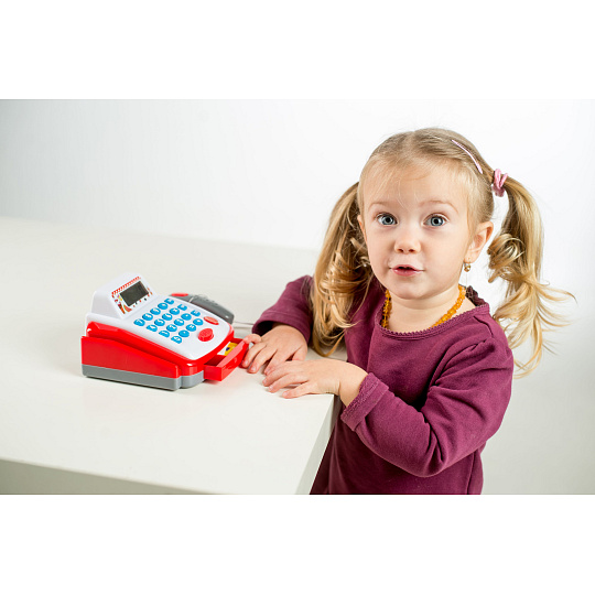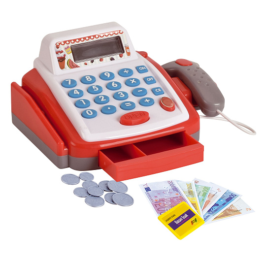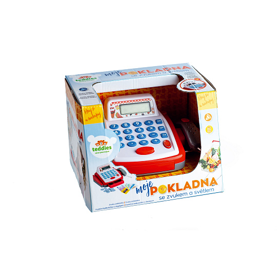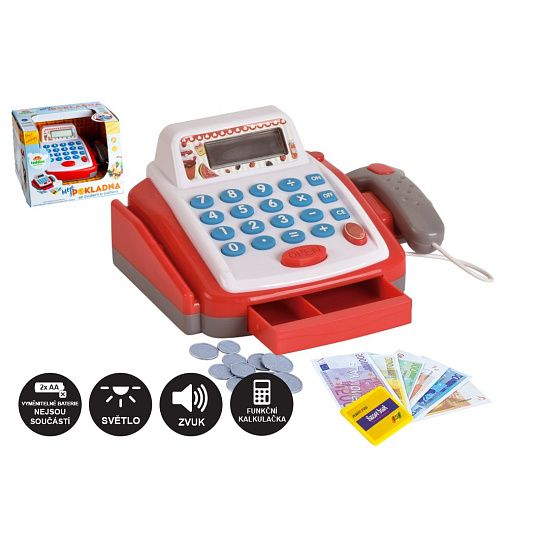 Dětská elektronická pokladna s doplňky pro každý správný obchod. Funkční kalkulačka s displejem, otevírací zásuvkou s penězi a světlem a zvukem u čtečky čárových kódů. Rozměr pokladny: 18 cm Rozměr krabice: 22 x 15 x 18 cm Na baterie - 2 ks baterií typu AA 1,5V - baterie nejsou součástí výrobku Vhodná pro děti od 3 let
