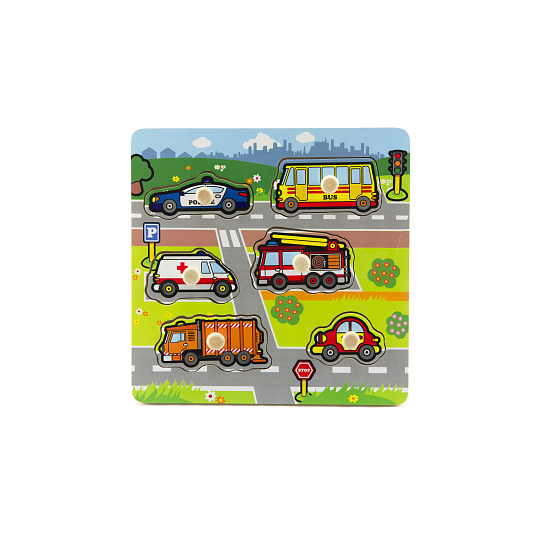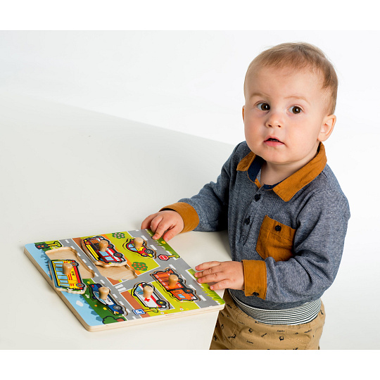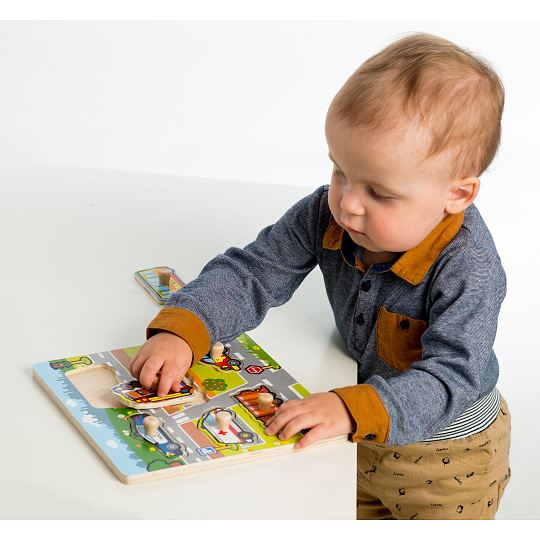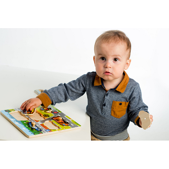Obsahuje 6 dílků s úchyty, které musí děti správně umístit do dřevěné desky s otvory tak, aby získaly obrázek silnce s auty. Velikost: 22,5 x 22,5 x 2,5 cm Vhodná od 12 měsíců.