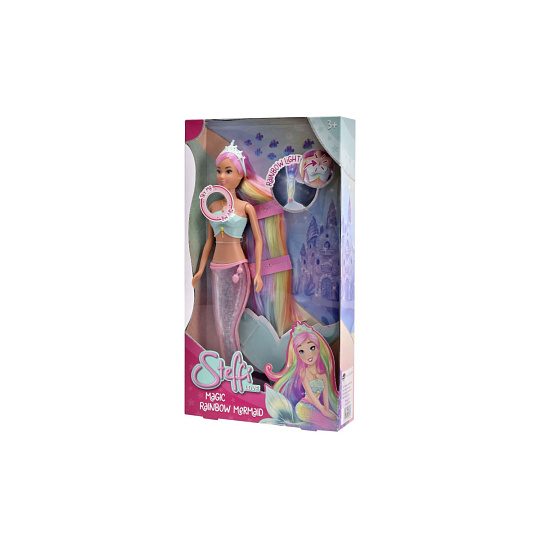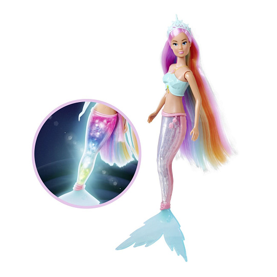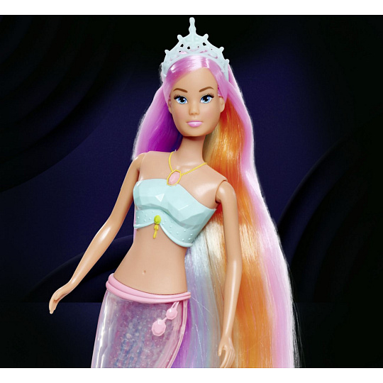 Panenka Steffi jako mořská víla s kouzelnou duhovou světelnou ploutví a extra dlouhými vlasy, voděodolná. Výška panenky 39 cm.