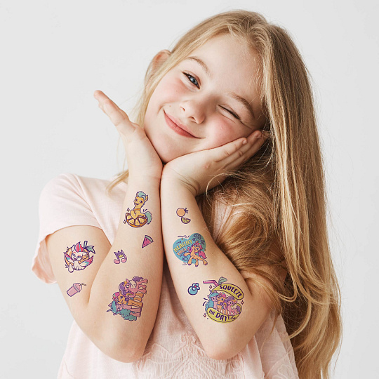Tetování s motivem My Little Ponny. Vyber si obrázek, nalep na místo, kde ho chceš mít, jemně potři vodou, sloupni papírek a je to! Rozměr obalu: 10,5 x 15 cm Vhodné pro děti od 3 let