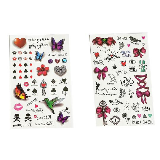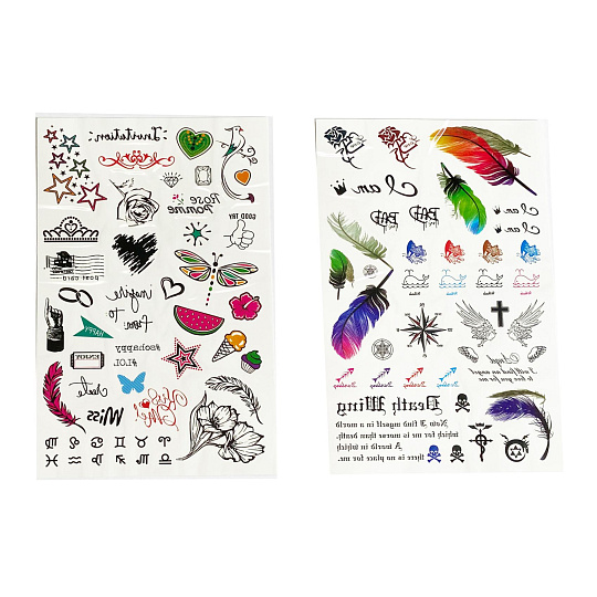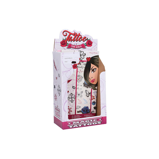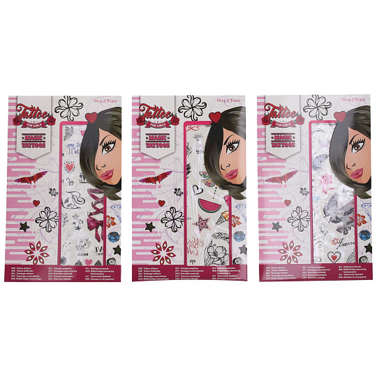 Tetovací samolepky holky. Více variant v display boxu. Rozměry archu: 15,3x0,1x25cm. Návod na aplikaci na obale: Sloupnout folii, přilepit papír s tetováním na pokožku, namočit a přitlačit houbičkou, sundat opatrně papír.