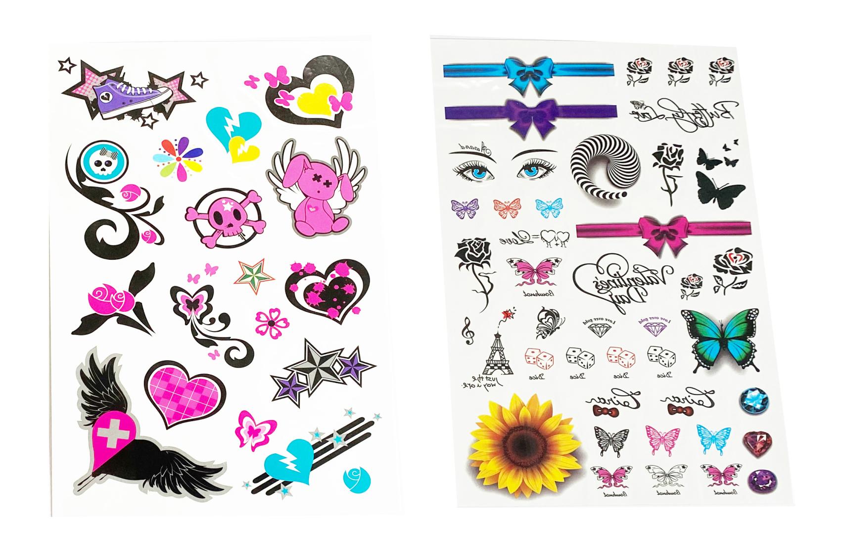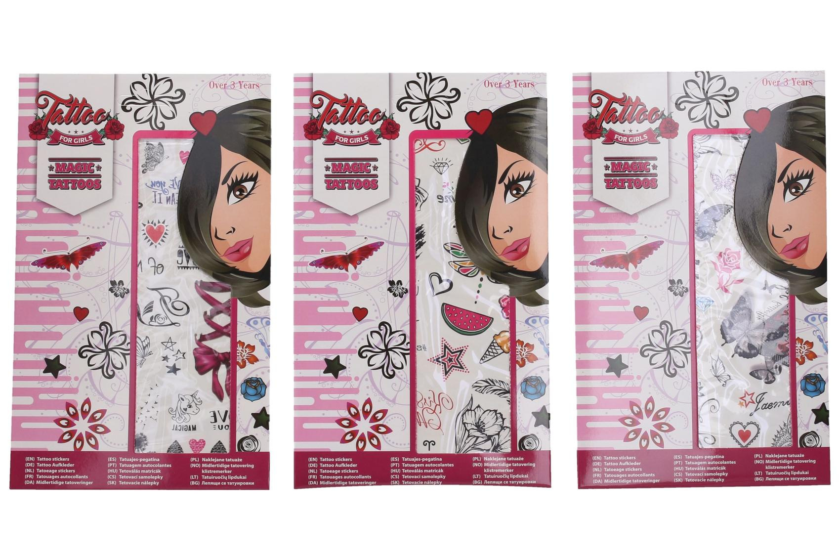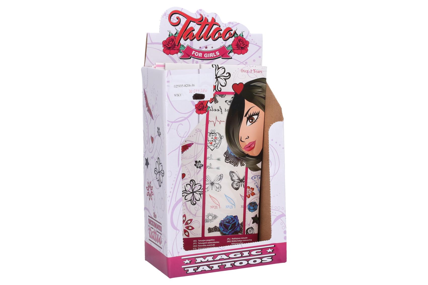 Tetovací samolepky holky. Více variant v display boxu. Rozměry archu: 15,3x0,1x25cm. Návod na aplikaci na obale: Sloupnout folii, přilepit papír s tetováním na pokožku, namočit a přitlačit houbičkou, sundat opatrně papír.