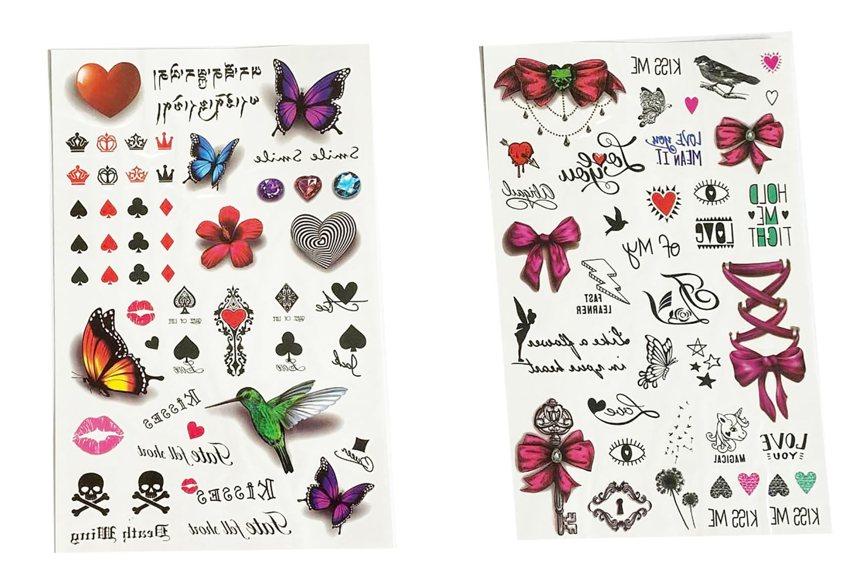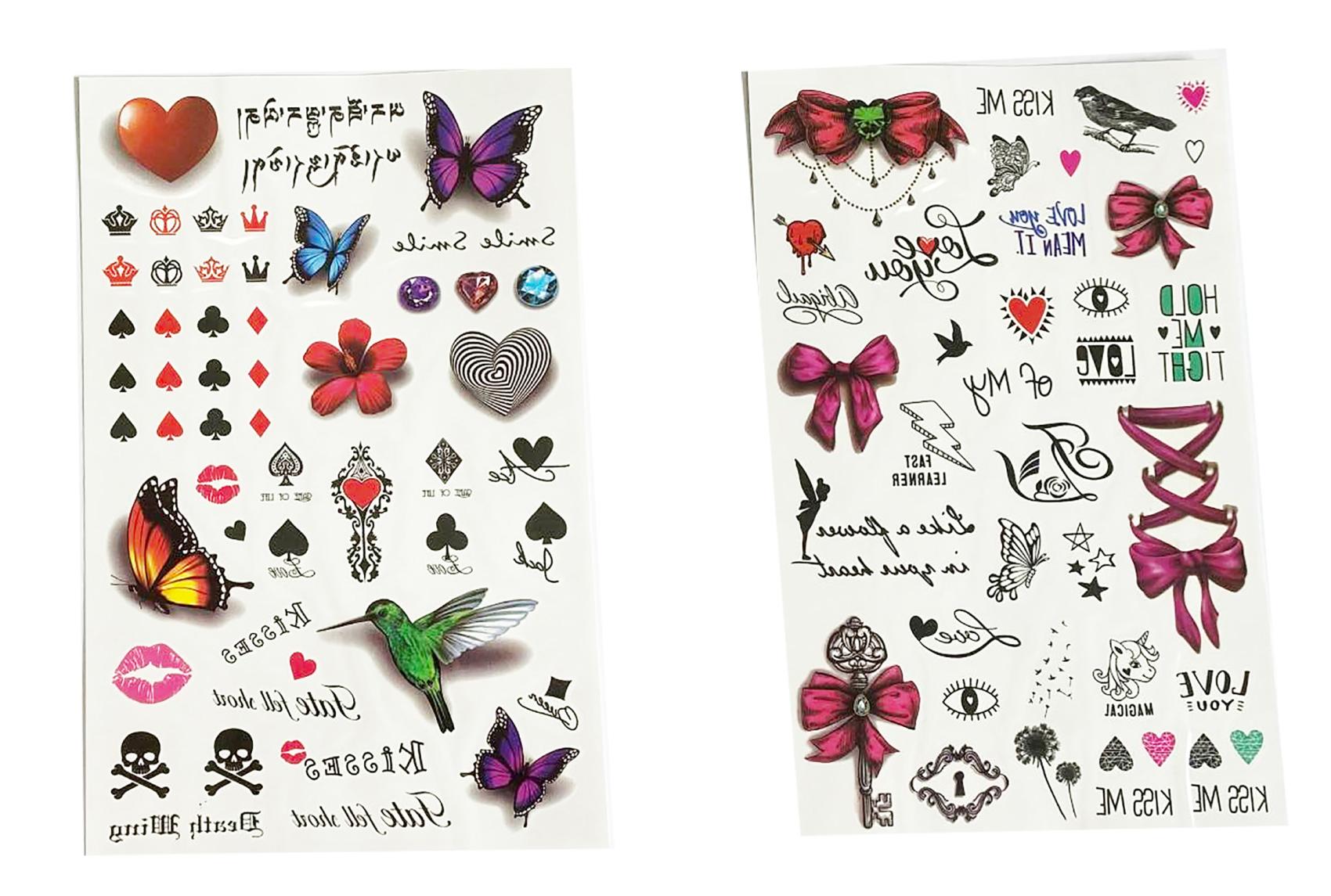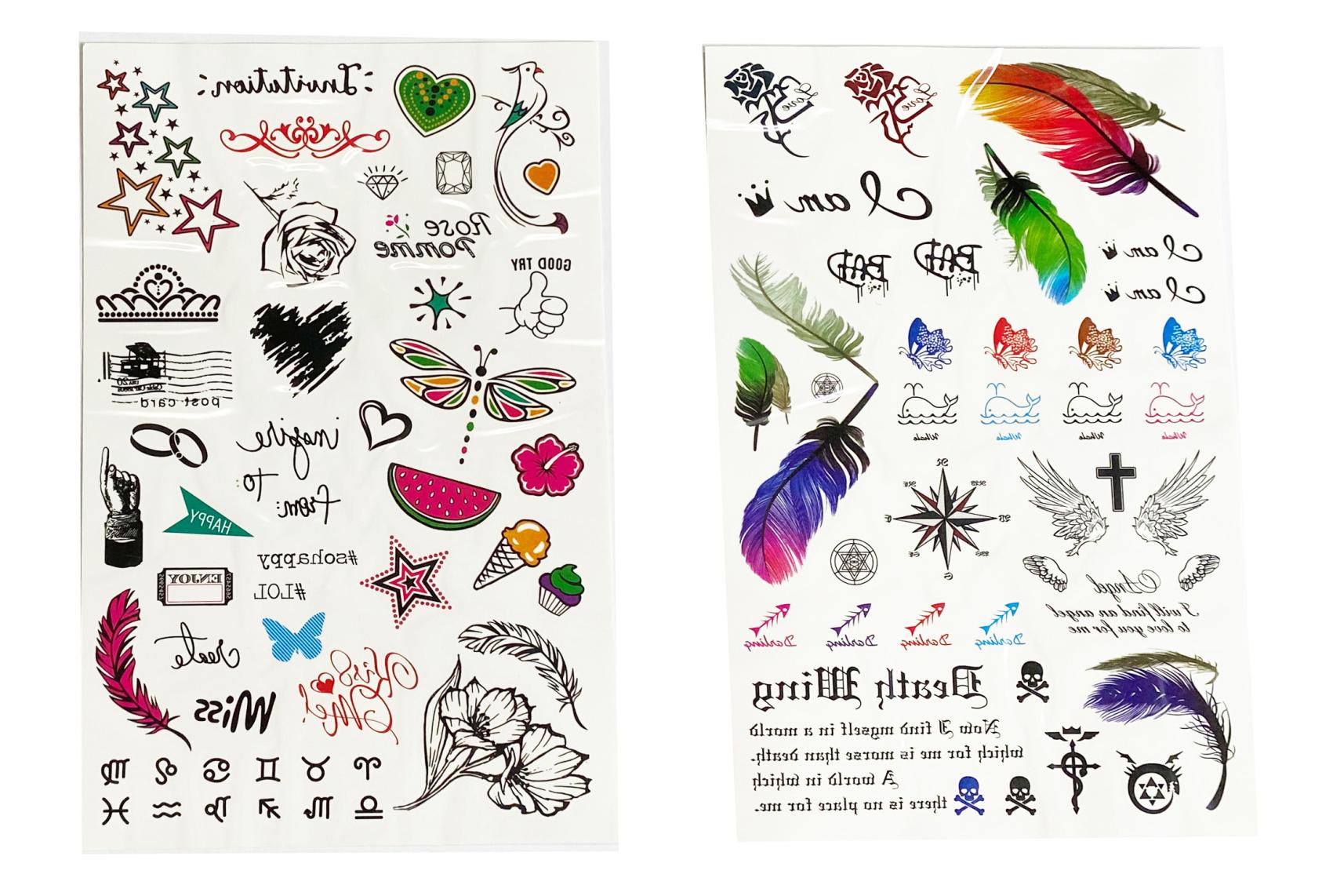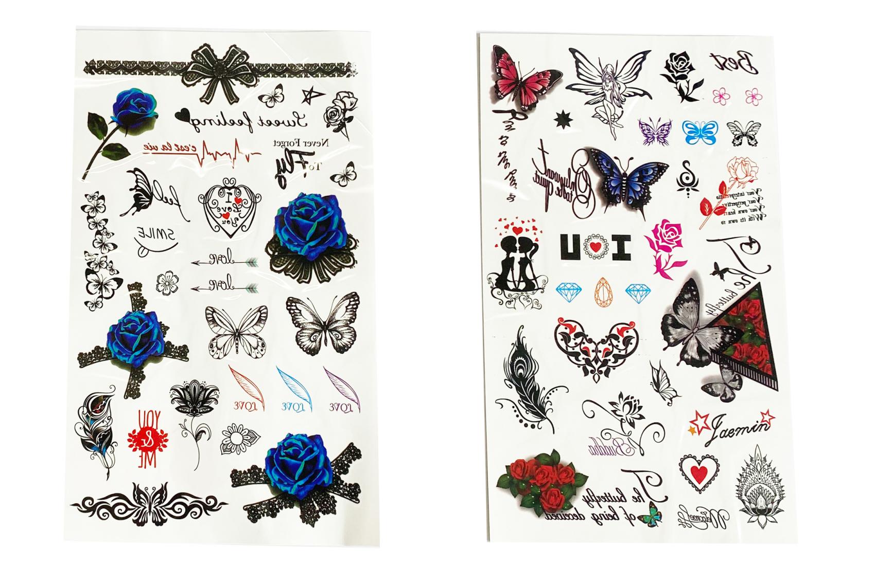 Tetovací samolepky holky. Více variant v display boxu. Rozměry archu: 15,3x0,1x25cm. Návod na aplikaci na obale: Sloupnout folii, přilepit papír s tetováním na pokožku, namočit a přitlačit houbičkou, sundat opatrně papír.