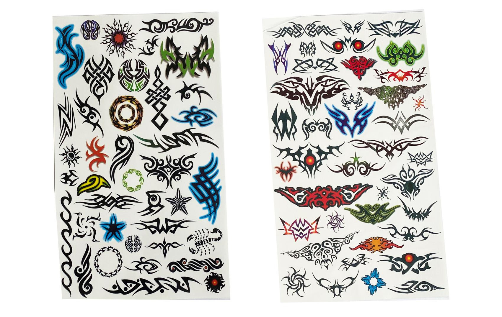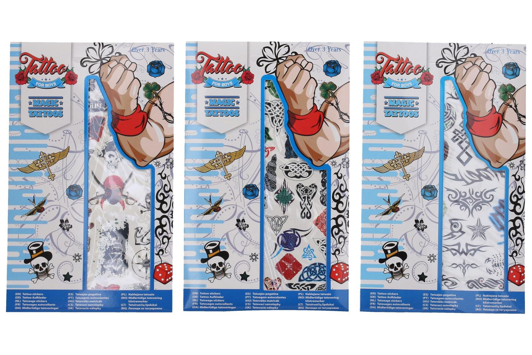 Tetovací samolepky kluci. Více variant v display boxu. Rozměry archu: 15,3x0,1x25cm. Návod na aplikaci na obale: Sloupnout folii, přilepit papír s tetováním na pokožku, namočit a přitlačit houbičkou, sundat opatrně papír.