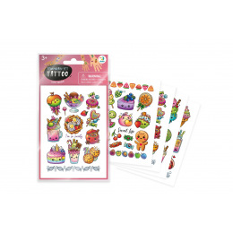 Ozdobte si své tělo krásným barevným tetováním. Vystřihněte vybraný obrázek. Přitiskněte ho na čistou a suchou pokožku Navlhčete ho vodou a po 30ti sekundách odstraňte papírek. Tetování lze odstranit mýdlem nebo olejíčkem. Vybrat si můžete z několika motivů oblíbených cukrovinek. Obsahuje 4 listy tetovaček. Rozměry balení 11,5 x 20 x 0,01 cm. Vhodné pro děti od 3 let.