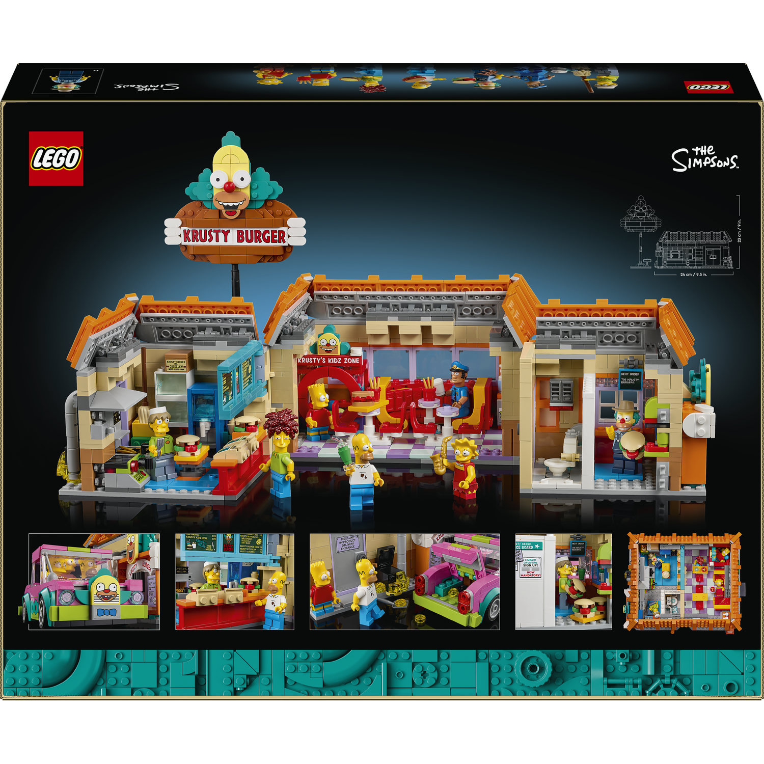 Vytvořte si detailní model oblíbené restaurace Homera s kuchyní, jídelnou, toaletou a okénkem pro ovladač. Tato povinná položka pro každého fanouška Simpsonových obsahuje také znak s logem Krusty Burger, repliku klaunského auta Homera a také minifigurky Homera, Barta a Lisy Simpsonových, farmáře Krustyho, Pomocníka Boba, Piszczyka a důstojníka Loua.