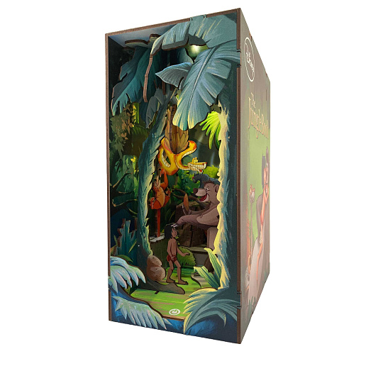 Knižní koutek ukazuje detailní scénu z Disneyho Knihy džunglí. Promyšlené LED osvětlení osvětlí váš miniaturní svět hřejivým a příjemným světlem. Precizně vyrobené dřevěné díly umožňují jejich snadnou montáž. Na drobné detaily budete potřebovat i lepidlo na dřevo, které není součástí balení.