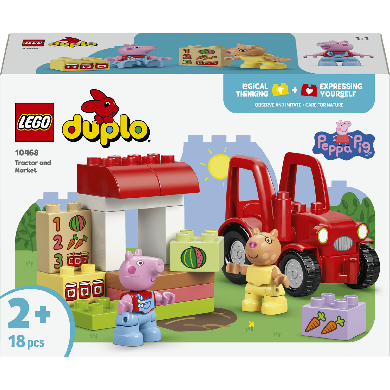 Pomozte batolatům rozvíjet kreativitu se stavebnicí Prasátko Peppa Traktor a Tržnice (10468). Děti od 2 let si užijí nápadité hraní na provoz farmářského obchodu a prodej potravin z kostek LEGO® DUPLO®. Tato stavebnice obsahuje figurku poníka Pétia Prasátka Peppy, pojízdný červený traktor a kostky v podobě mrkve, melounu a sklenice marmelády. Tato vzdělávací hračka pro batolata pomáhá rozvíjet jejich schopnosti a dovednosti. Pozorováním a napodobováním scén ze seriálu můžou děti zlepšit své kog nitivní schopnosti, jako je řešení problémů a trénování paměti. K sestavení traktoru a stáje využijí malí stavitelé své jemné motorické dovednosti. Stavebnice obsahuje menu zdobené melounem, mrkví a sklenicemi s marmeládou. Batolata si procvičí rozpoznávání a přiřazování čísel při hledání odpovídající zdobené kostky. Stavebnice obsahuje 18 dílků.