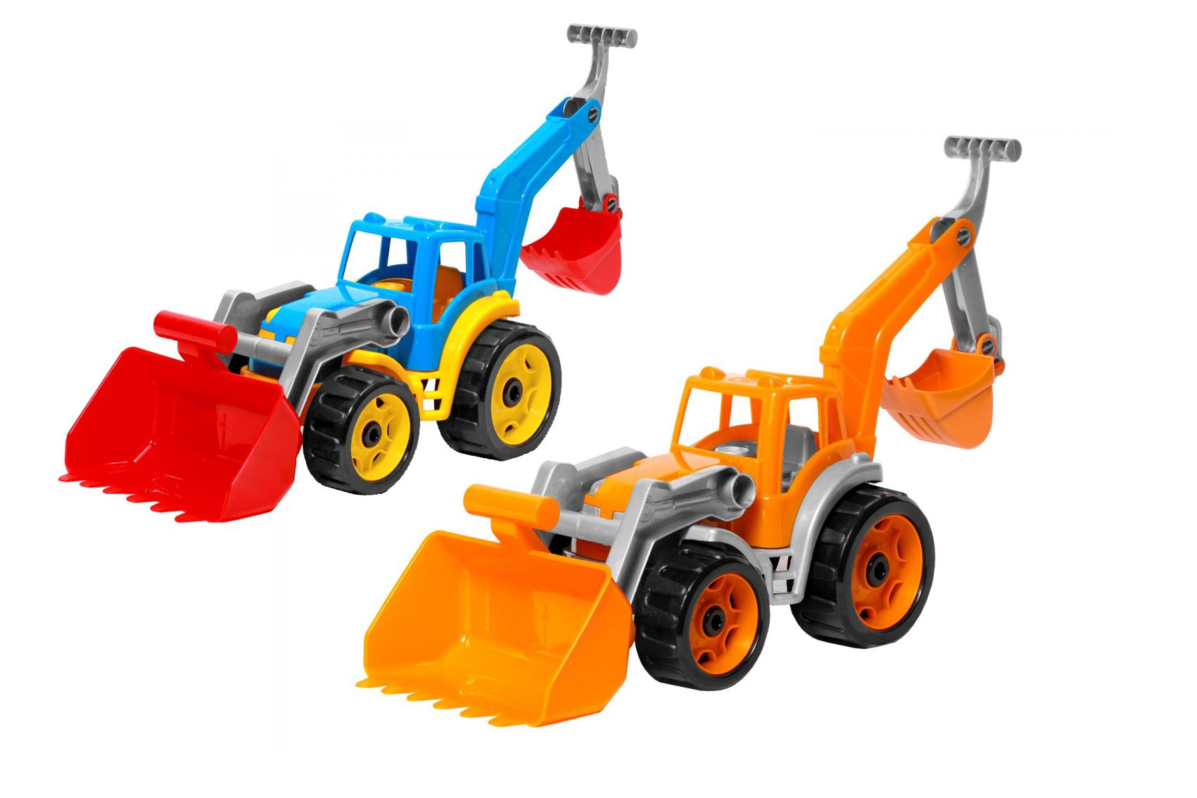 Teddies Traktor/nakladač/bagr se 2 lžícemi plast na volný chod 2 barvy v síťce 16x35x16cm