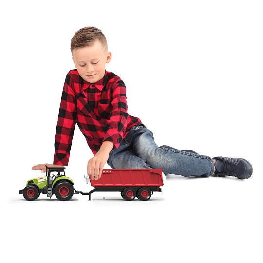 Moderní traktor s vlečkou hračka z kolekce Moje malá farma. Nepostradatelný pomocník pro každého malého farmáře! Vlečku můžeš jednoduše odpojit a traktor využít k dalším pracím. Traktor jezdí na setrvačník a jeho délka včetně vlečky je 36 cm. Zmáčknutím jakýchkoliv ze třech tlačítek traktor vydává reálné zvuky. Traktor funguje na 3x 1,5V AG13 baterie, které jsou součástí balení.