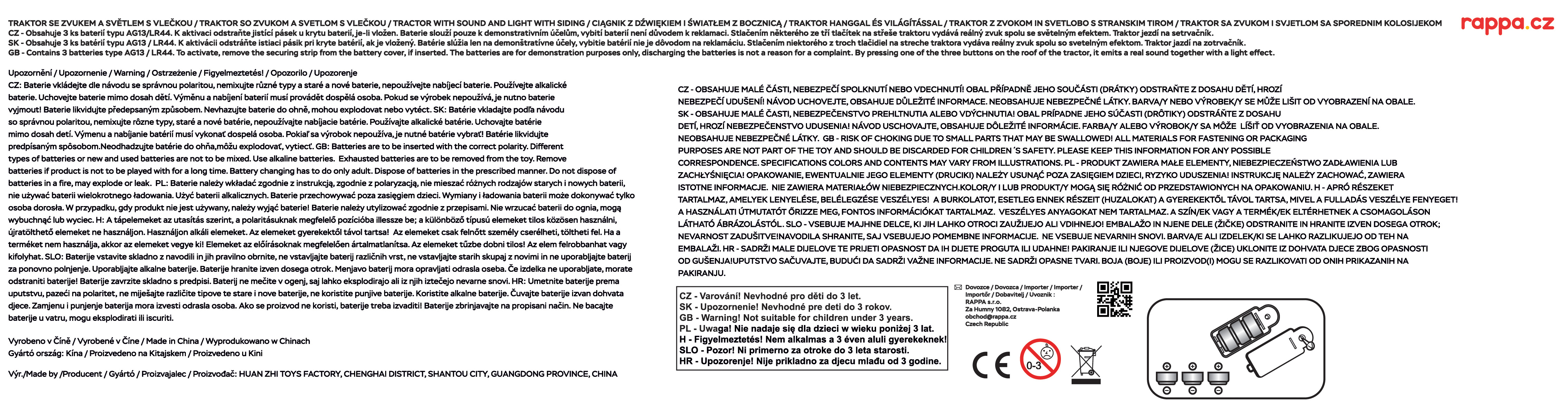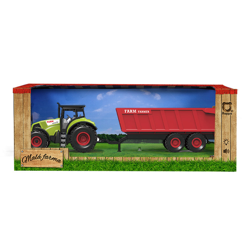 Moderní traktor s vlečkou hračka z kolekce Moje malá farma. Nepostradatelný pomocník pro každého malého farmáře! Vlečku můžeš jednoduše odpojit a traktor využít k dalším pracím. Traktor jezdí na setrvačník a jeho délka včetně vlečky je 36 cm. Zmáčknutím jakýchkoliv ze třech tlačítek traktor vydává reálné zvuky. Traktor funguje na 3x 1,5V AG13 baterie, které jsou součástí balení.