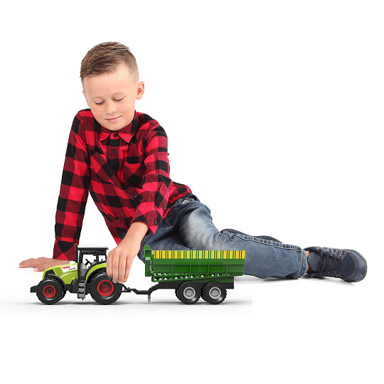 Moderní plastový traktor s vlečkou, hračka z kolekce Moje malá farma. Nepostradatelný pomocník pro každého malého farmáře! Vlečku můžeš jednoduše odpojit a traktor využít k dalším pracím. Traktor jezdí na setrvačník a jeho délka včetně přívěsu je 37 cm. Zmáčknutím tlačítek traktor vydává reálné zvuky. Traktor vyžaduje 3 ks baterií typu AG13/LR44, které jsou součástí balení.