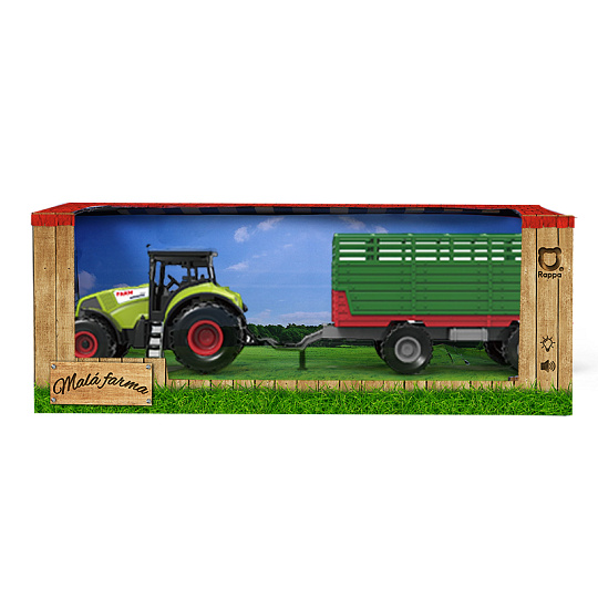 Moderní plastový traktor s vlečkou na seno, hračka z kolekce Moje malá farma. Nepostradatelný pomocník pro každého malého farmáře! Vlečku můžeš jednoduše odpojit a traktor využít k dalším pracím. Traktor jezdí na setrvačník a jeho délka včetně přívěsu je 37 cm. Zmáčknutím tlačítek traktor vydává reálné zvuky. Traktor vyžaduje 3 ks baterií typu AG13/LR44, které jsou součástí balení.