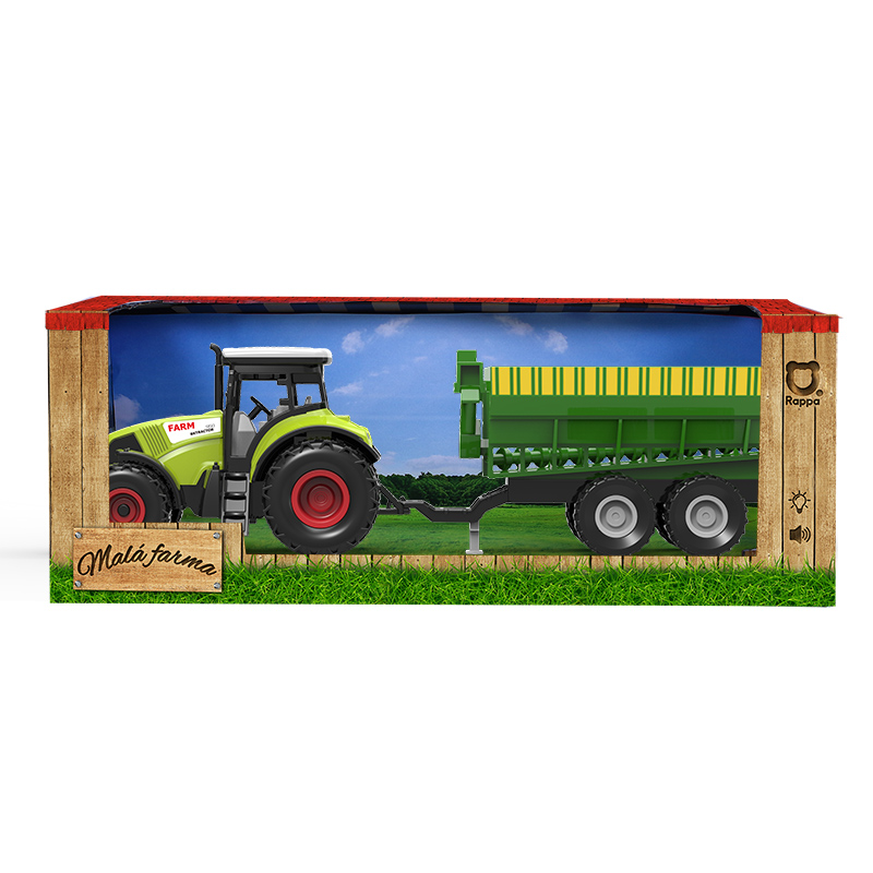 Moderní plastový traktor s vlečkou, hračka z kolekce Moje malá farma. Nepostradatelný pomocník pro každého malého farmáře! Vlečku můžeš jednoduše odpojit a traktor využít k dalším pracím. Traktor jezdí na setrvačník a jeho délka včetně přívěsu je 37 cm. Zmáčknutím tlačítek traktor vydává reálné zvuky. Traktor vyžaduje 3 ks baterií typu AG13/LR44, které jsou součástí balení.